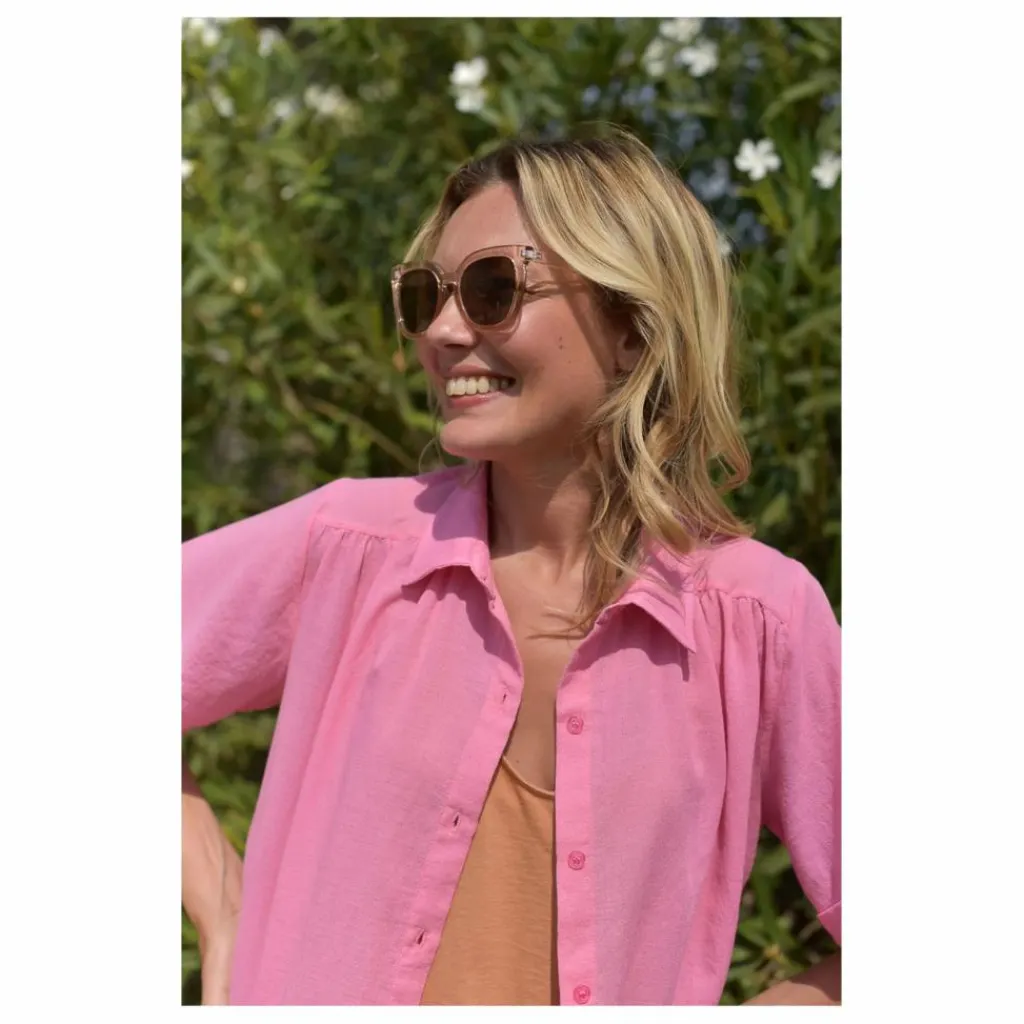 - coton léger coloris rose bonbon – coupe chemise – manches courtes à revers – boutonnage ton sur ton