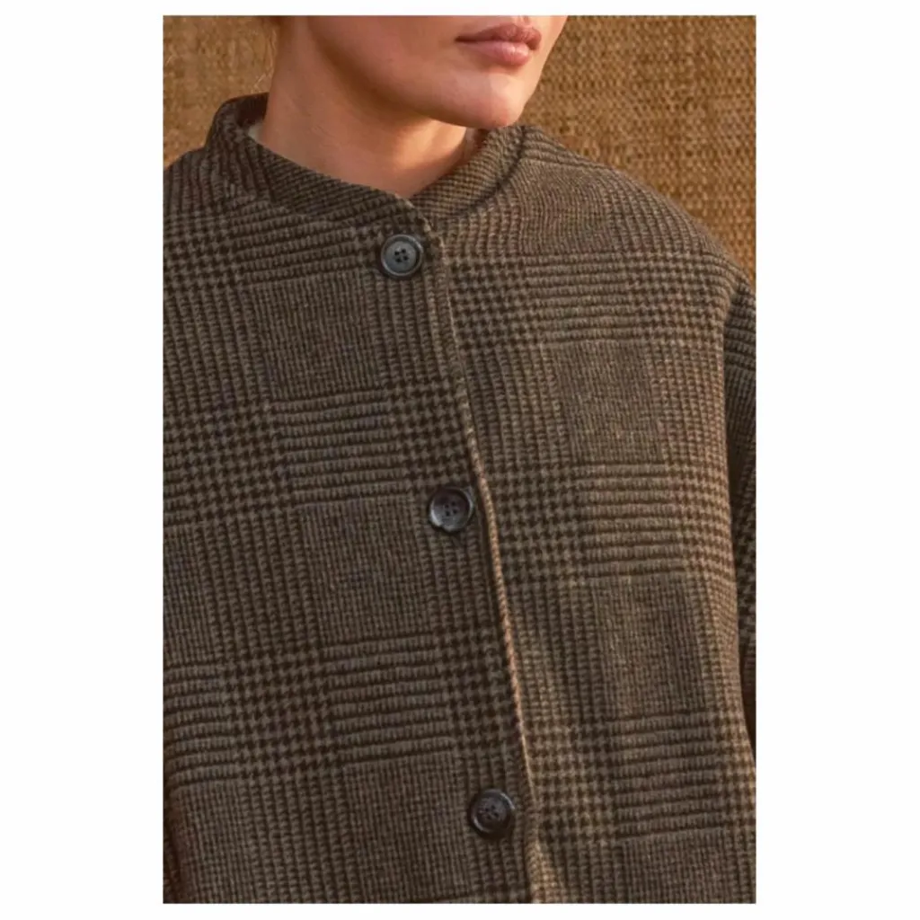- Le manteau court qui revisite le motif à carreaux dans un esprit casual chic. Composé majoritairement de laine il offre chaleur et souplesse. Sa coupe ample, son col rond, sa fermeture boutonnée et sa base légèrement resserrée en font une pièce idéale pour les superpositions de saison.
