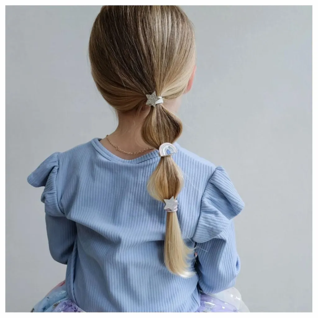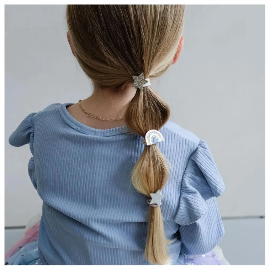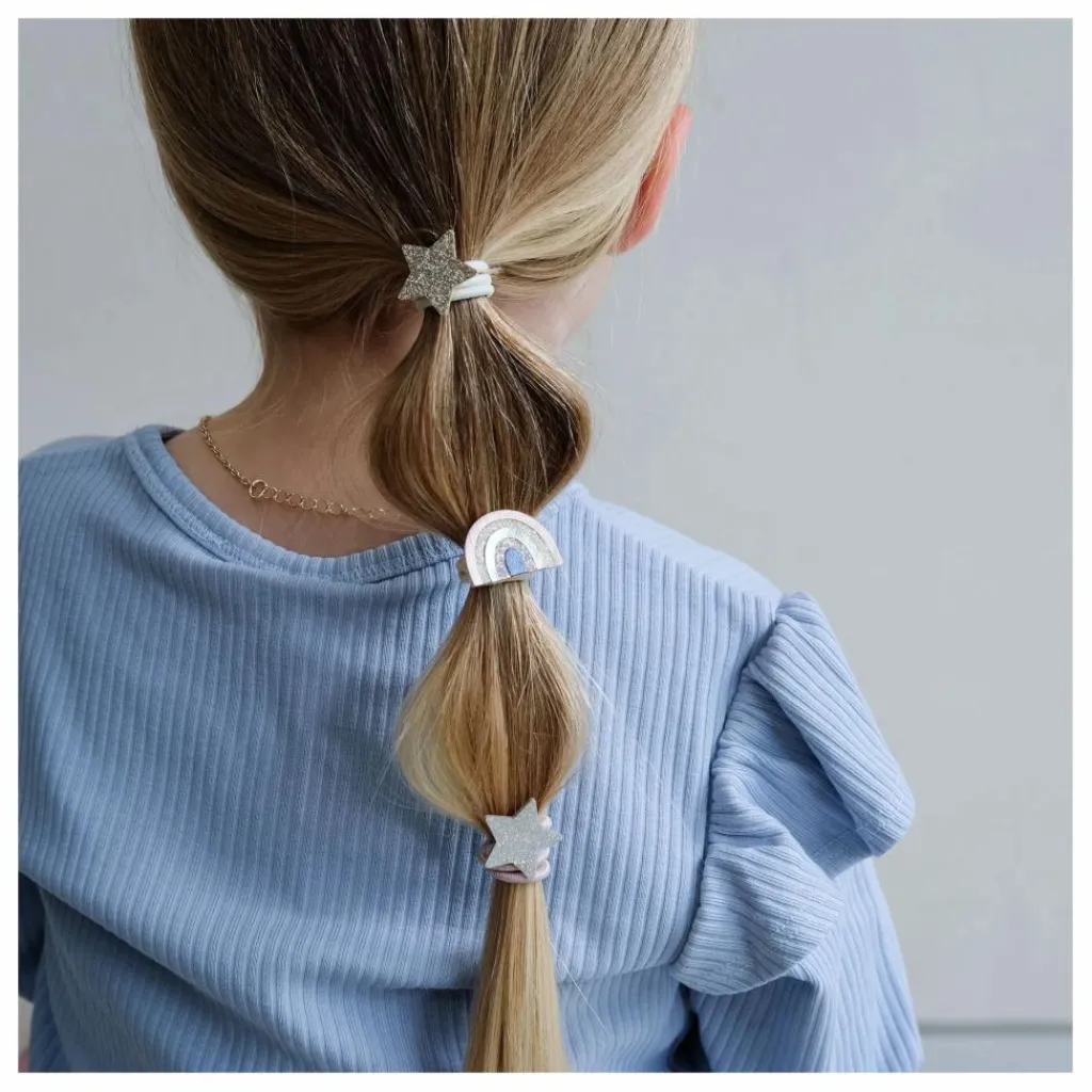 - – 6 par paquet – élastiques résistants et extensibles de 5 cm ornés d’arcs-en-ciel et d’étoiles soigneusement fabriqués à partir de tissus métalliques doux et de paillettes étincelantes