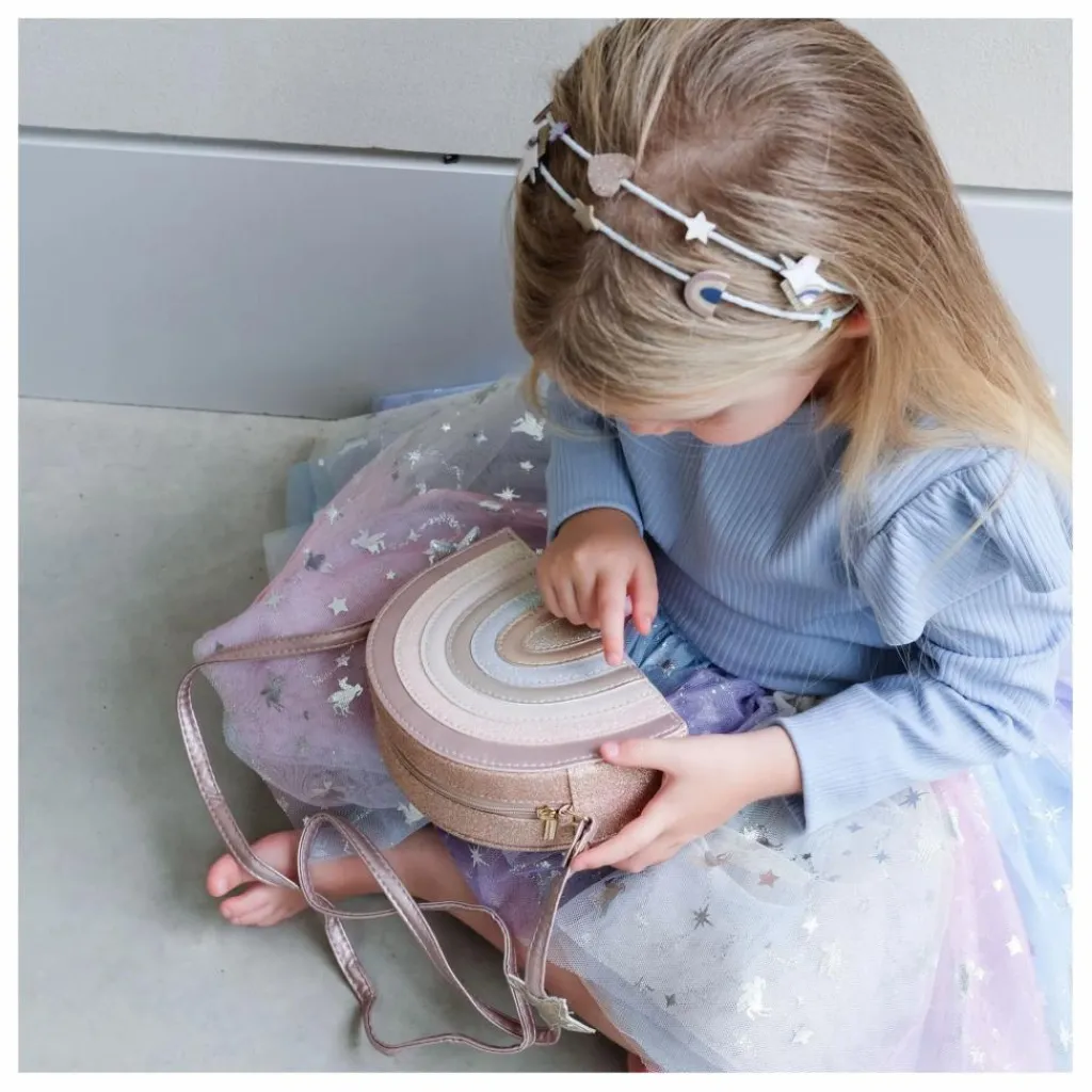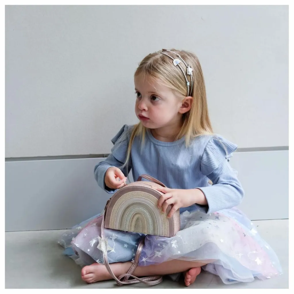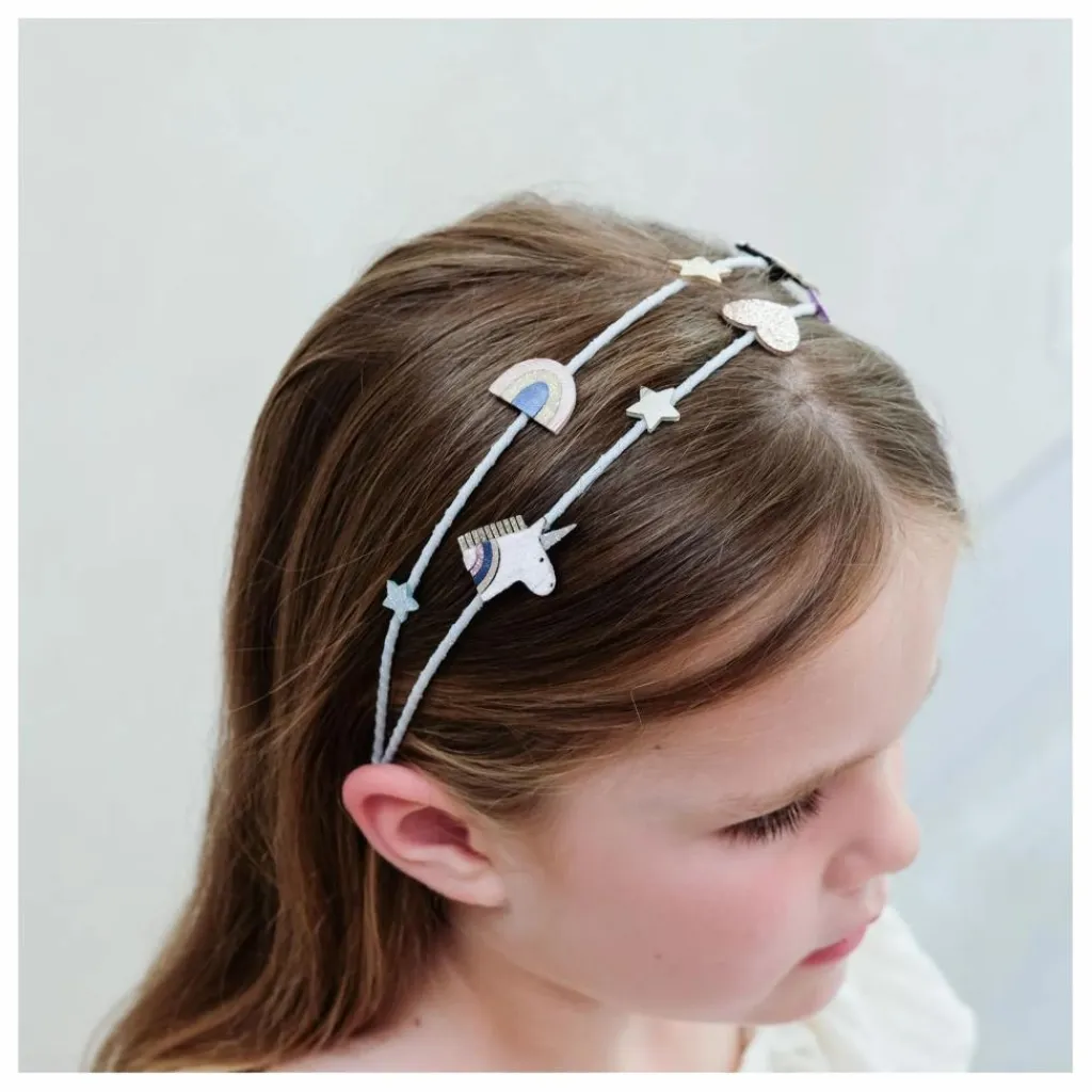 - – Bande Alice adaptée aux 3-10 ans – Deux rangées de rubans pailletés bleu pâle ornés de licornes, d’arcs-en-ciel, d’étoiles et de cœurs confectionnés dans un joli mélange de velours doux, de paillettes et de tissus métalliques.