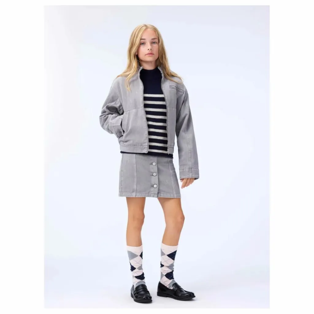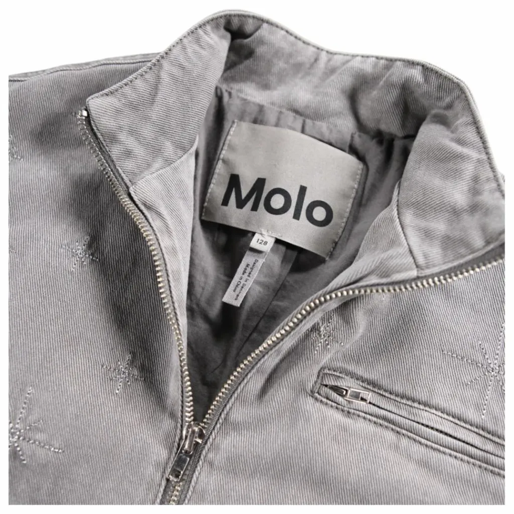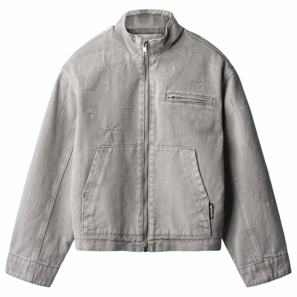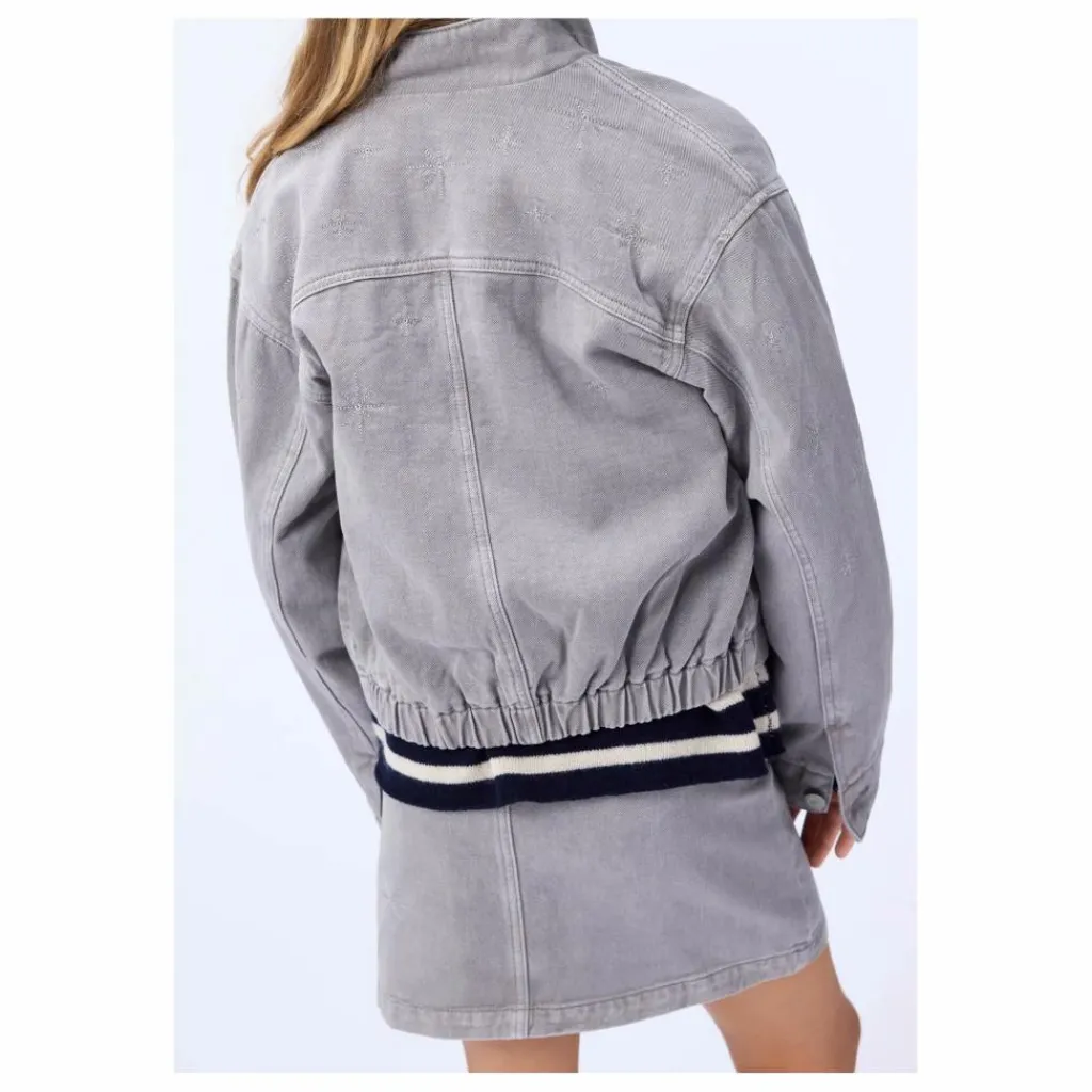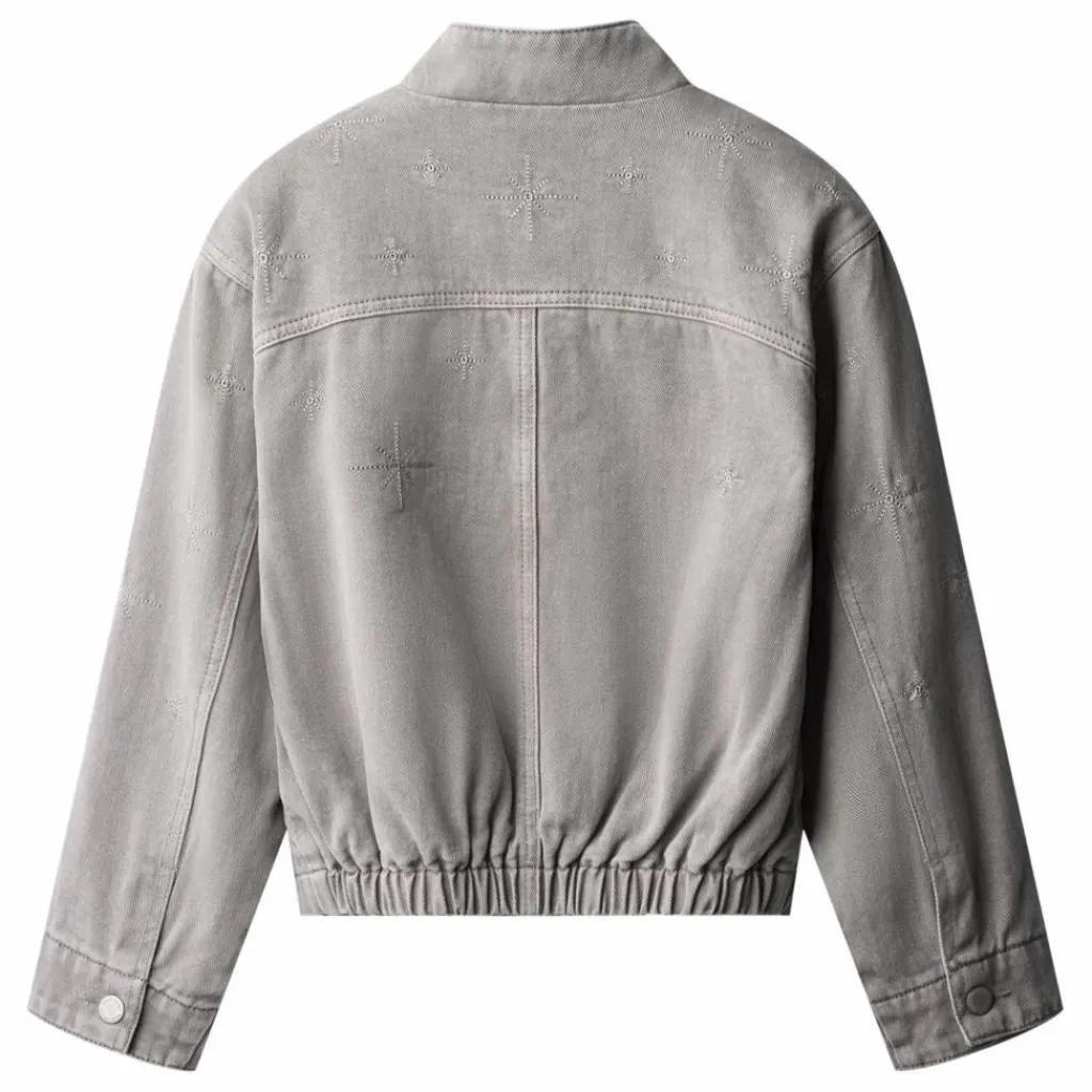 - Cette veste en denim gris avec des étoiles brodées en fil d’argent a un col montant, une fermeture à glissière pratique sur le devant, des poches cousues sur le devant, une poche de poitrine avec fermeture à glissière et des poignets avec fermeture à bouton. La veste a une coupe régulière et un élastique dans le dos, qui permet une coupe ajustée autour des hanches. Portez cette veste à l’extérieur comme à l’intérieur et associez-la à une jupe assortie.