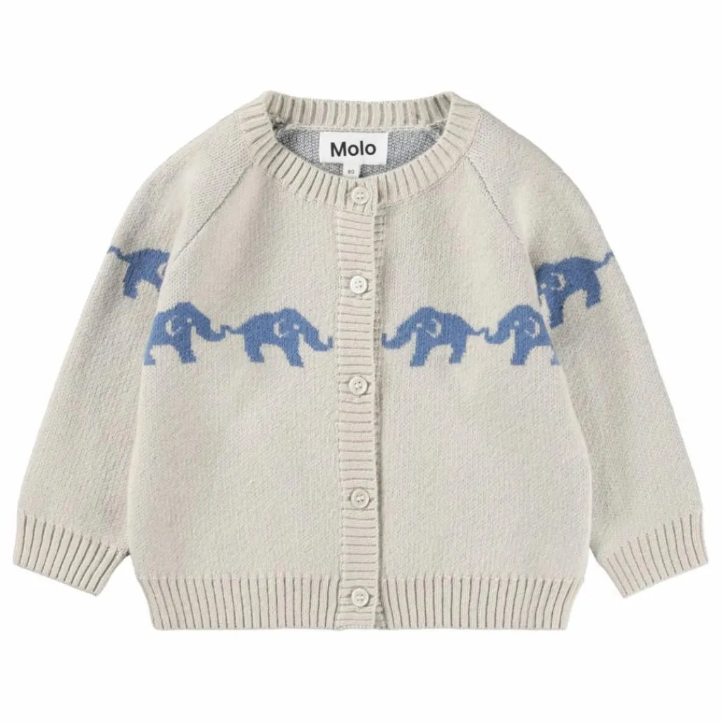 - Ce cardigan en tricot blanc cassé de Molo est réalisé dans un doux mélange de coton et de laine avec une bordure d’éléphants bleus. Le cardigan présente une encolure ronde avec des côtes, des côtes à la taille et aux manches, et une fermeture boutonnée sur le devant.