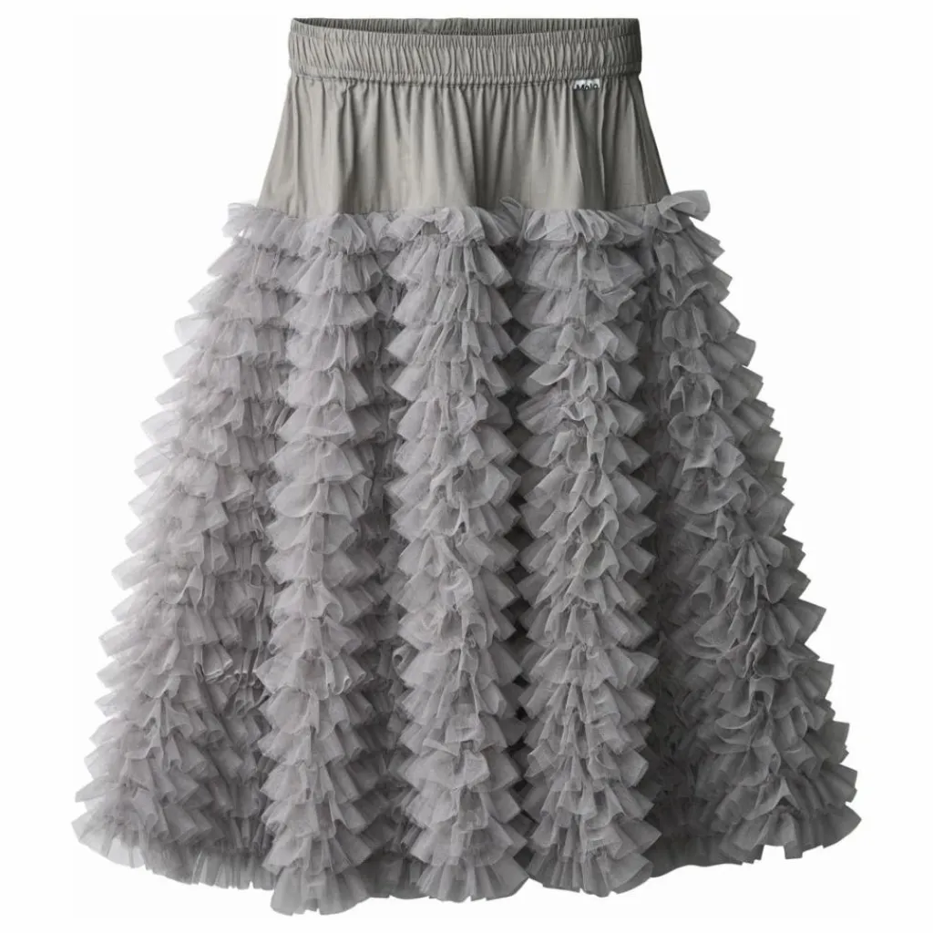 - Cette jupe en tulle gris de Molo a une coupe volumineuse avec de nombreuses couches de tulle qui ressemblent à des volants. L’élastique à la taille assure un ajustement confortable, et la jupe descend jusqu’au milieu du tibia.