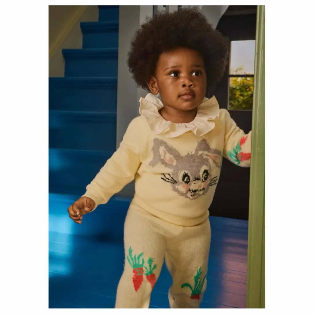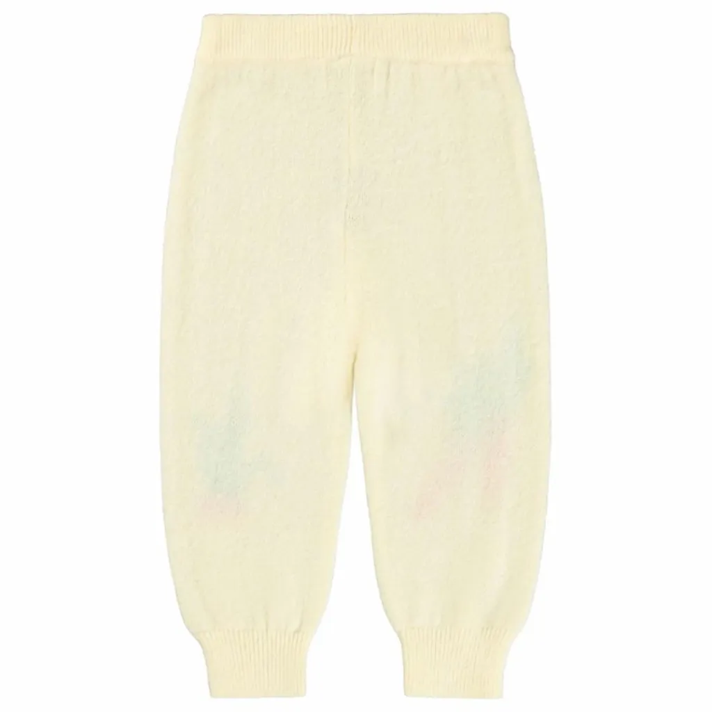 - Ce pantalon jaune clair de Molo est fabriqué en tricot doux avec des carottes aux genoux. Le pantalon a un élastique à la taille et des poignets côtelés aux chevilles.