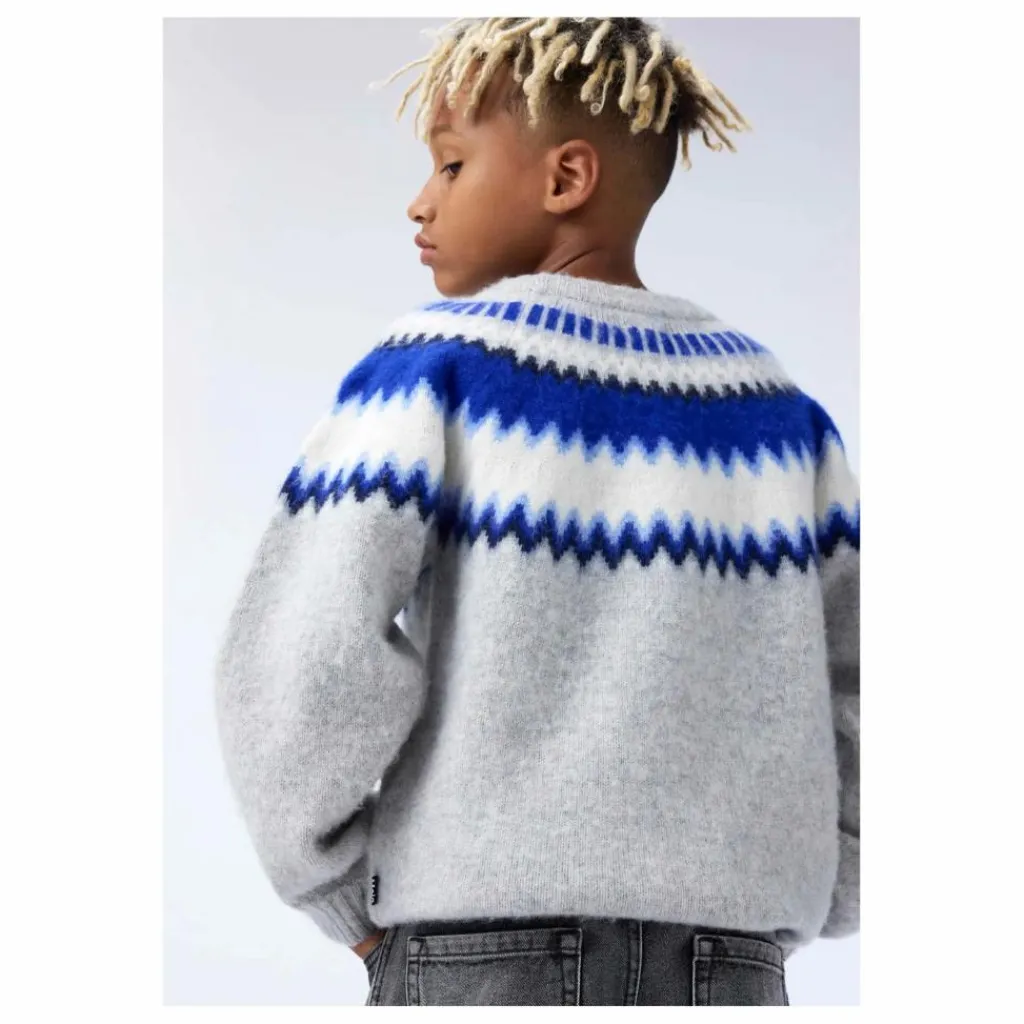 - Ce pull en maille de laine gris clair de Molo présente un motif bleu d’inspiration nordique. Il présente une encolure ronde, des manches raglan, des bords côtelés et une coupe régulière.