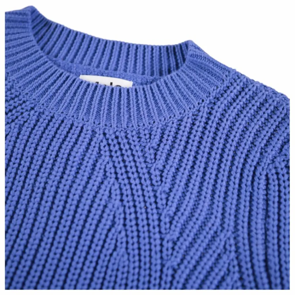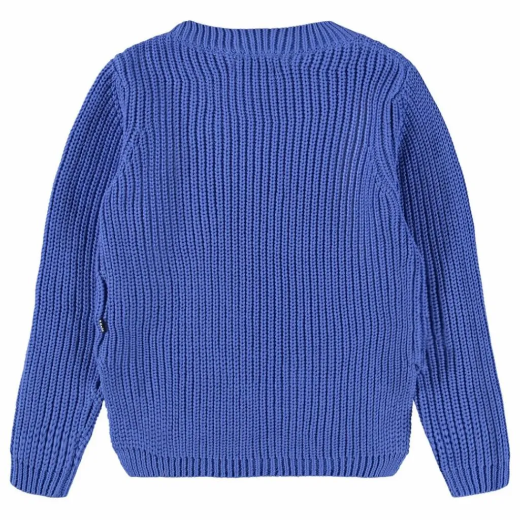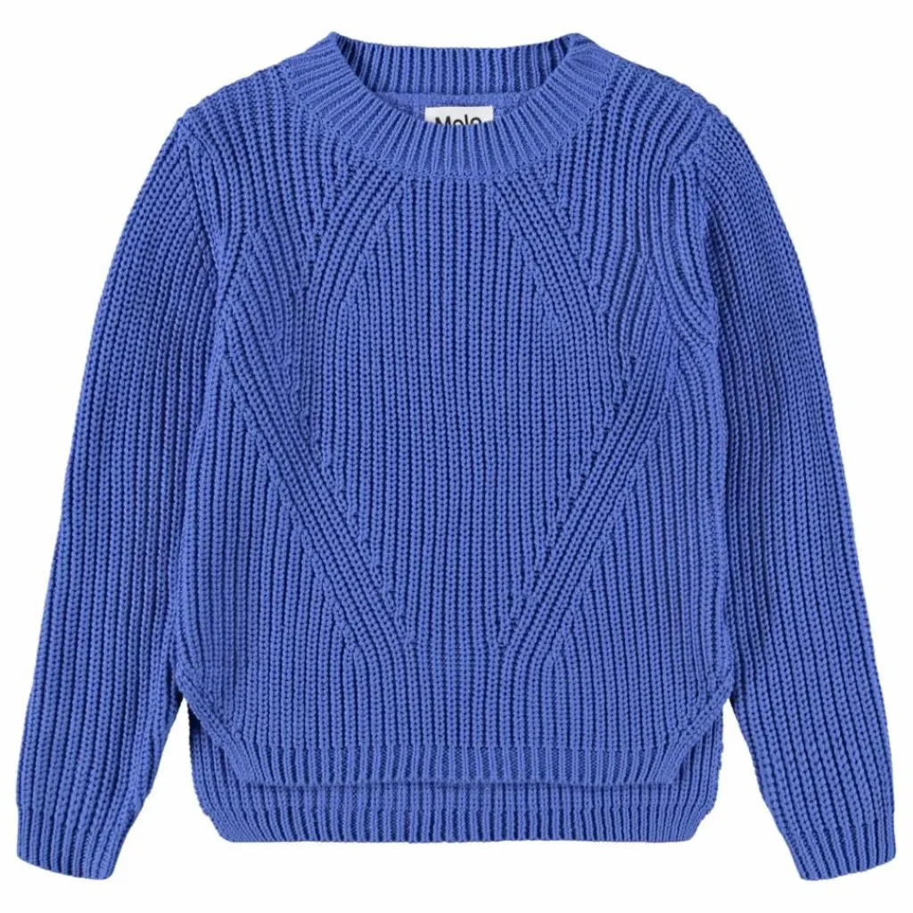 - Ce pull bleu à manches longues en tricot de Molo est confectionné en coton biologique doux et présente un col rond. Le pull a une coupe ample, est côtelé avec un motif fin, une longueur supplémentaire dans le dos et des fentes sur les côtés.