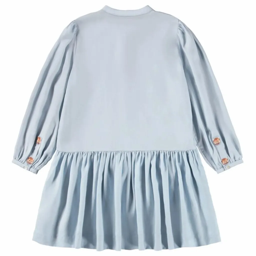 - Cette robe bleu clair de Molo est en viscose et comporte de jolis boutons sur le devant, deux poches et une jupe circulaire attachée. La robe se ferme par des boutons aux manches et présente un joli imprimé animalier près des boutons et au-dessus des poches.