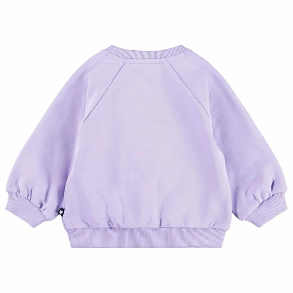 - Ce cardigan violet clair de Molo est fabriqué en jersey de coton biologique et comporte des volants sur le devant. Le cardigan a des manches raglan, des boutons pression et des bords côtelés au niveau du col, des manches et du bas.
