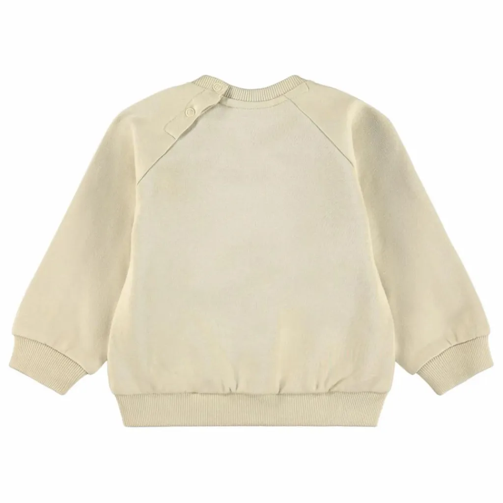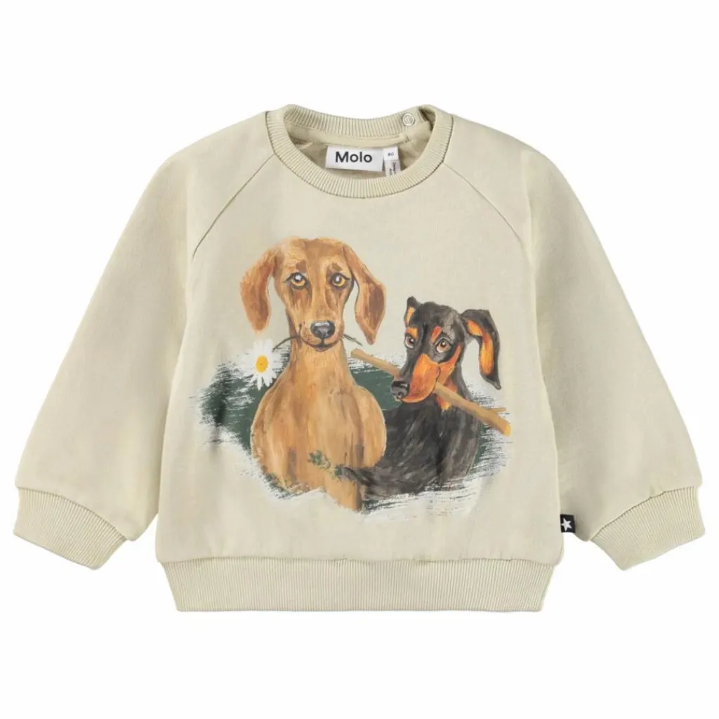 - Ce sweat beige de Molo est fabriqué en jersey de coton biologique et présente un imprimé de chien sur le devant. Le sweat a des manches raglan, des bordures côtelées à la taille et aux manches, et une encolure ronde avec deux boutons pression au dos.