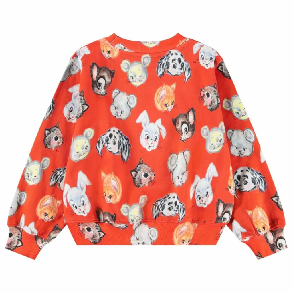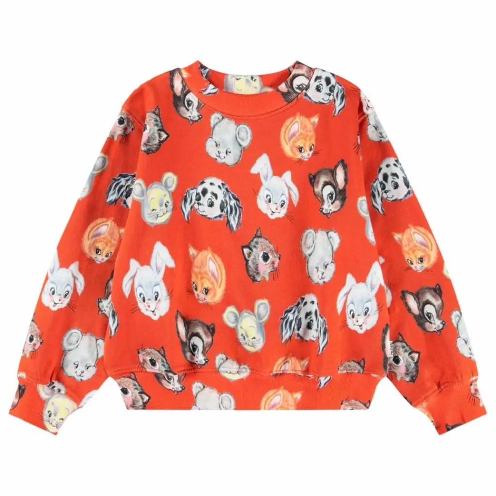 - Ce sweat-shirt orange de Molo est fabriqué en coton biologique, avec un col rond et des bords côtelés autour du cou, du bas et des manches. Le sweat a une coupe oversize et un imprimé d’animaux mignons dessinés.