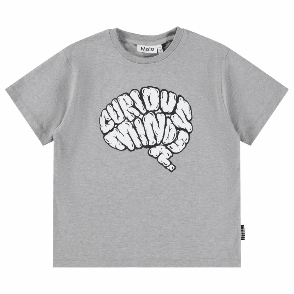 - Ce t-shirt gris mélangé de Molo est fabriqué en coton biologique doux, avec des manches courtes et une encolure côtelée. Ce t-shirt à la coupe ample est orné d’un texte blanc sur le devant indiquant « Curious minds ?