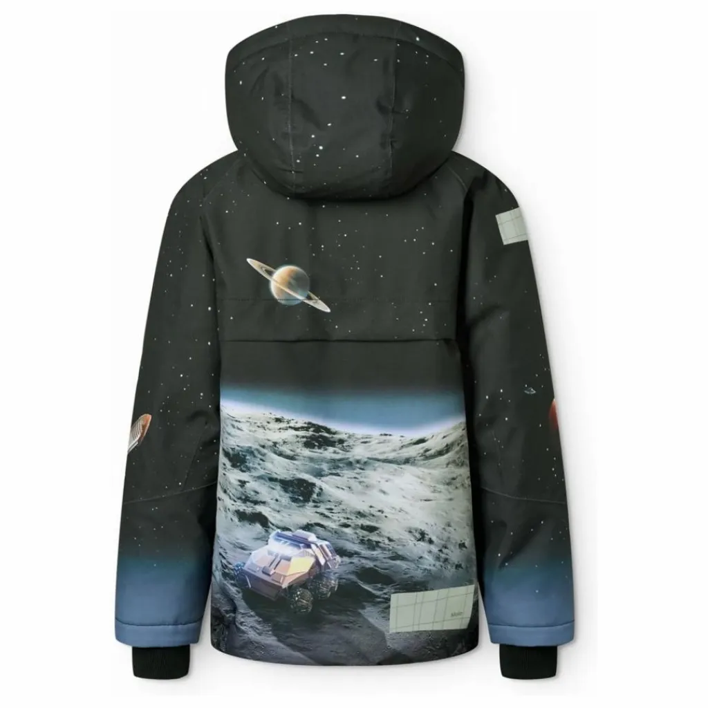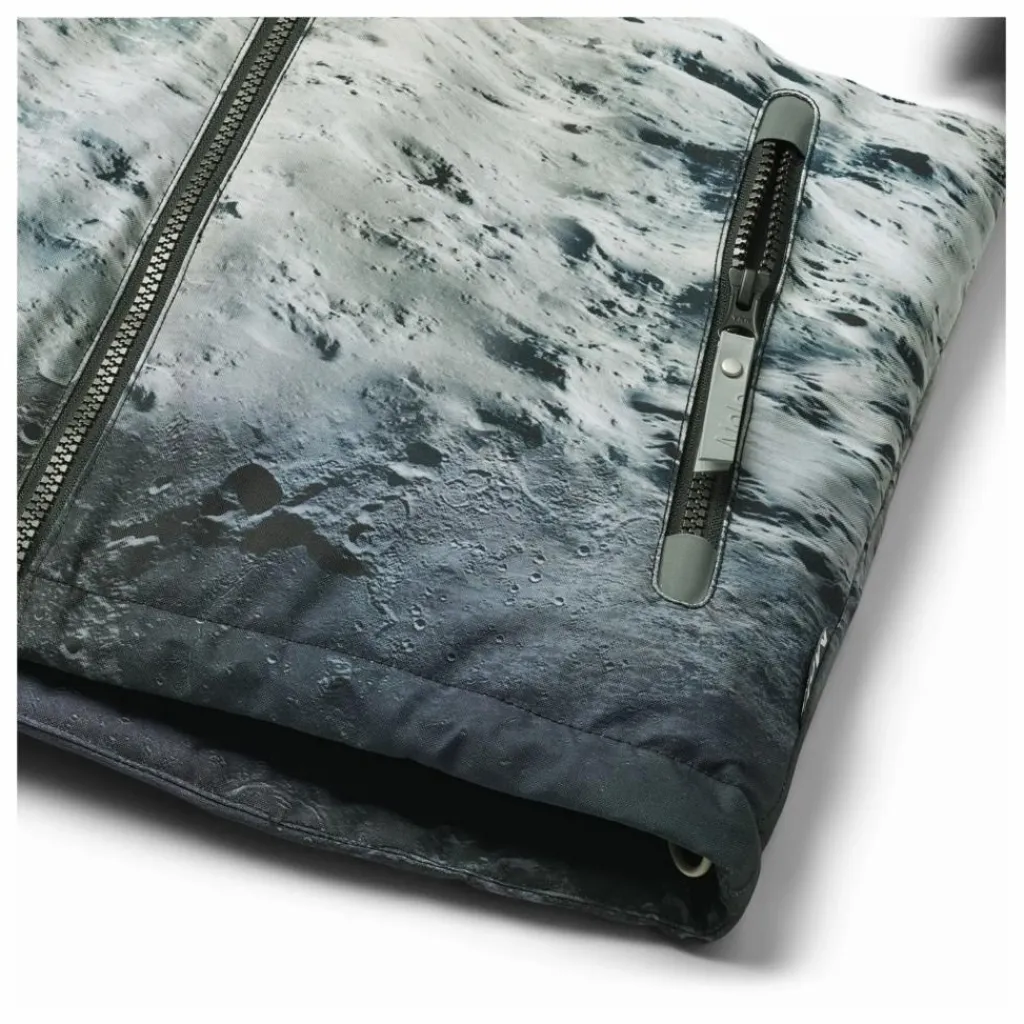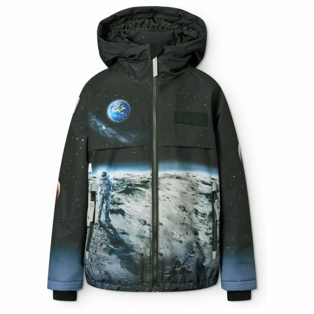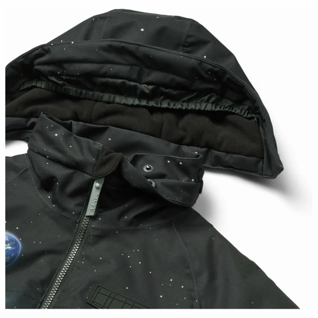 - Cette veste d’hiver noire et bleue de Molo est fabriquée en polyester recyclé et présente un imprimé de l’homme sur la lune. Elle est dotée d’une capuche doublée amovible, d’une fermeture à glissière pratique, de poches zippées en polaire, de poignets côtelés et d’un élastique au bas de la veste pour une protection efficace contre le vent. Dans le dos, il y a un grand réflecteur. En outre, il est doublé de polaire et rembourré de 3M™ Thinsulate™. Caractéristiques : – Coupe-vent et imperméable – Pression de la colonne d’eau : 20 000 mm – Respirabilité : 20 000 g/m2/24h – Coutures étanches – 3M™ Thinsulate™ (température jusqu’à -20°C) – Sans PFC (PFOS et PFOA) – Réflecteur pour une meilleure visibilité dans la circulation – Garde-neige dans les manches – Capuche amovible doublée de polaire – Doublure en polaire dans les poches – Capuche amovible doublée de polaire.
