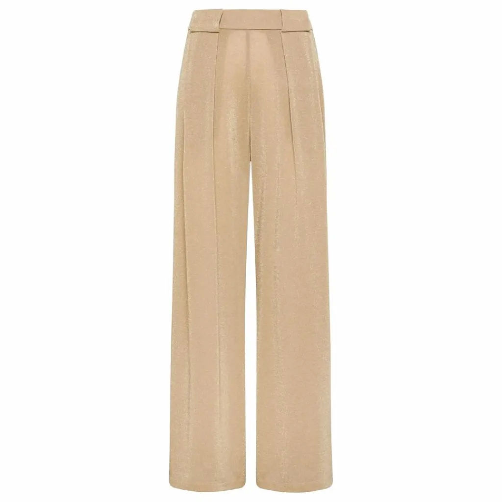 - Pantalon en jersey lurex, large. Plis avant maintenus par de grandes boucles, poches latérales et ceinture élastiquée au dos.