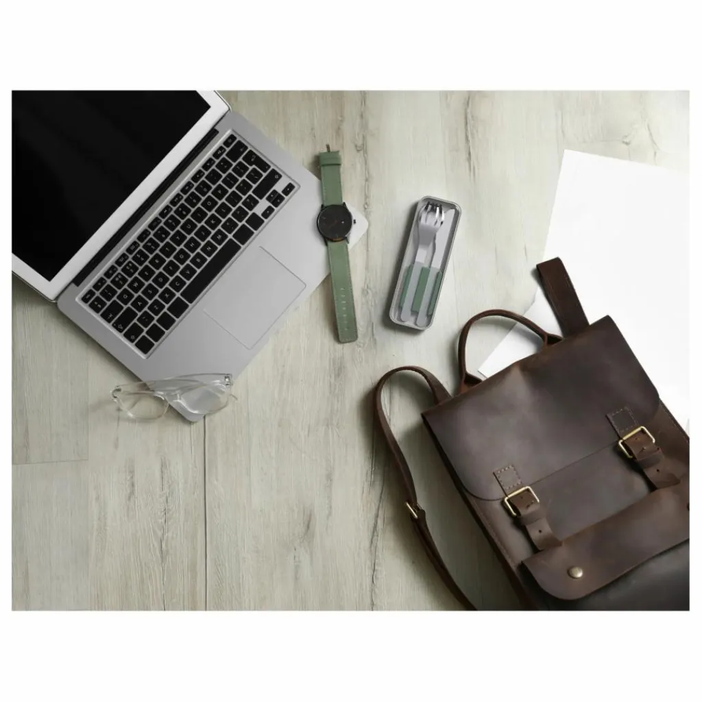 - Contient : 1 fourchette, 1 couteau, 1 cuillère. Manches ergonomiques et texturés, 1 support souple de maintien, 1 boîte de protection