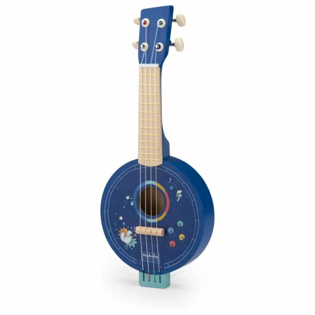 - Banjo en bois à 4 cordes en métal pour nos apprentis musiciens. L’instrument est orné d’une peinture holographique bleue ponctuée des couleurs éclatantes de l’univers de Puce & Pilou. Fabriqué en bois, il est léger et de taille idéale pour les enfants.