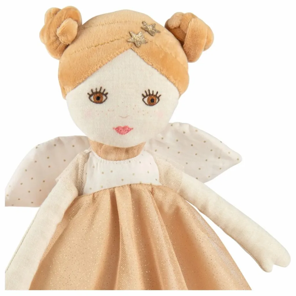 - Au visage délicat brodé et sérigraphié, coiffée de deux jolis chignons de velours parés d’une jolie étoile, Mélusine la fée est vêtue d’une robe champagne avec tulle pailleté couleur or et ailes de fée dans le dos et de petits chaussons brillants.