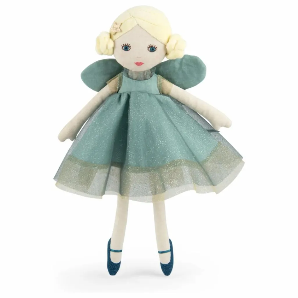 - Au visage délicat brodé, coiffée de deux jolis chignons de velours décoré d’une petite étoile brillante, Ondine la fée est vêtue d’une robe bleue au tulle pailleté couleur or et ailes de fée dans le dos et petits chaussons brillants.
