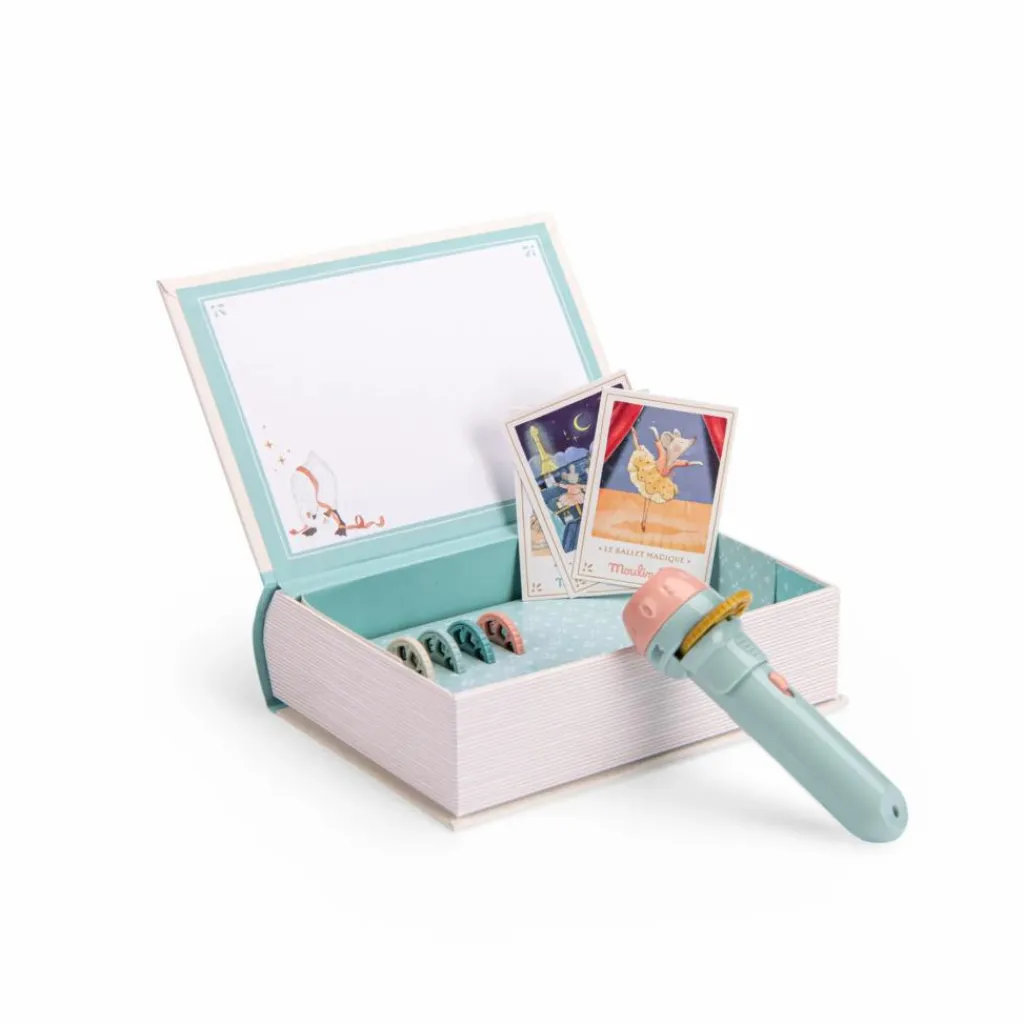 Ce coffret aimanté a été conçu comme un livre. Il contient une lampe à projeter avec 5 histoires de contes joliment illustrées de La Petite Ecole de Danse et de précieux cartons d’invitation aux spectacles, en forme de mini cartes postales.