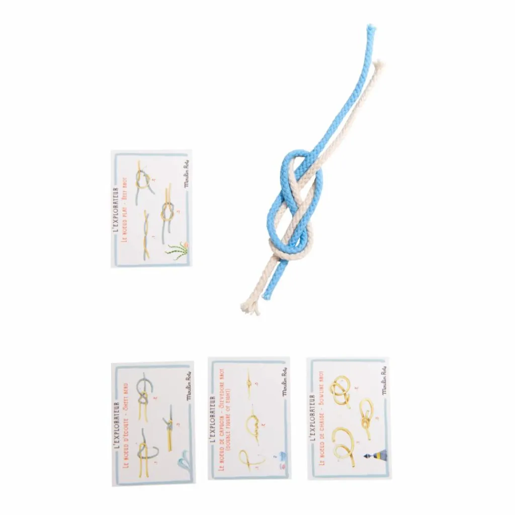 Cette boîte illustrée comprend deux cordes couleur bleu et naturel pour apprendre à réaliser facilement différents noeuds, ainsi que quatre cartes imprimées recto-verso servant de tutoriel. Noeud en huit ou noeud plat, votre enfant découvrira toutes les combinaisons possibles grâce à ces deux cordelettes. Adaptées aux petites mains des apprentis moussaillons, elles se manipulent très facilement. Le contraste de couleurs permet de bien différencier les deux cordes, facilitant ainsi la réalisation des noeuds.
