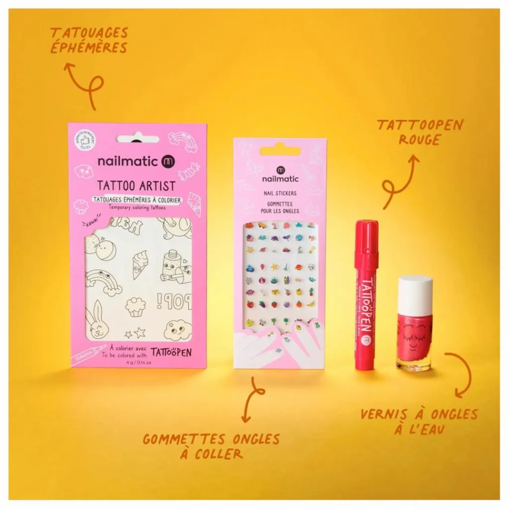 Planche de tatouages : Sur une peau propre et sèche, appliquez le tatouage face contre la peau après avoir retiré le film transparent. Humidifiez-le avec une éponge ou un gant mouillé, patientez 30 secondes, puis retirez délicatement le papier. Pour l’enlever, utilisez simplement une huile pour bébé ou un lait démaquillant. Usage unique.