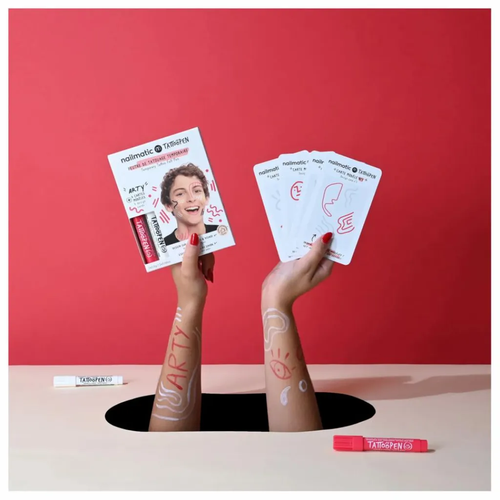 - Contient un feutre de tatouage rouge, un feutre de tatouage blanc, 4 cartes recto/verso avec des modèles à tester et une carte mode d’emploi recto/verso.