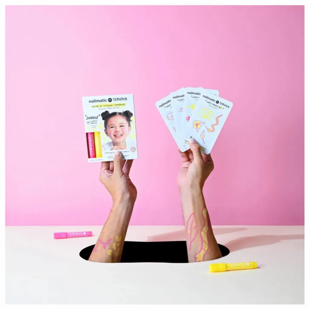 - Contient un feutre de tatouage rose, un feutre de tatouage jaune, 4 cartes recto/verso avec des modèles à tester et une carte mode d’emploi recto/verso.