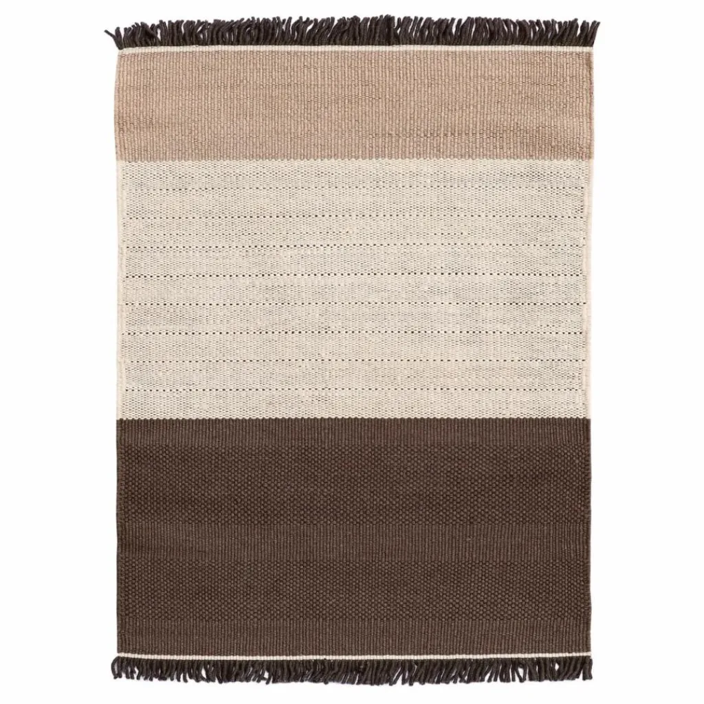 Tres est un tapis indien traditionnel à tissage plat Dhurrie. Sa qualité unique réside dans la production de trois pièces indépendantes dans lesquelles différentes fibres prédominent.La proportion et la combinaison de laine, de feutre et de coton génèrent des changements de tons et d’irrégularités dans le tissage, donnant vie au motif.