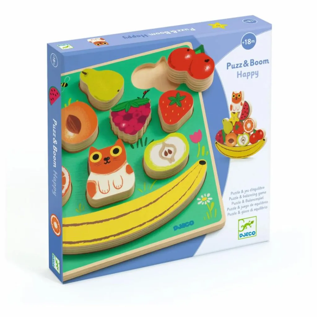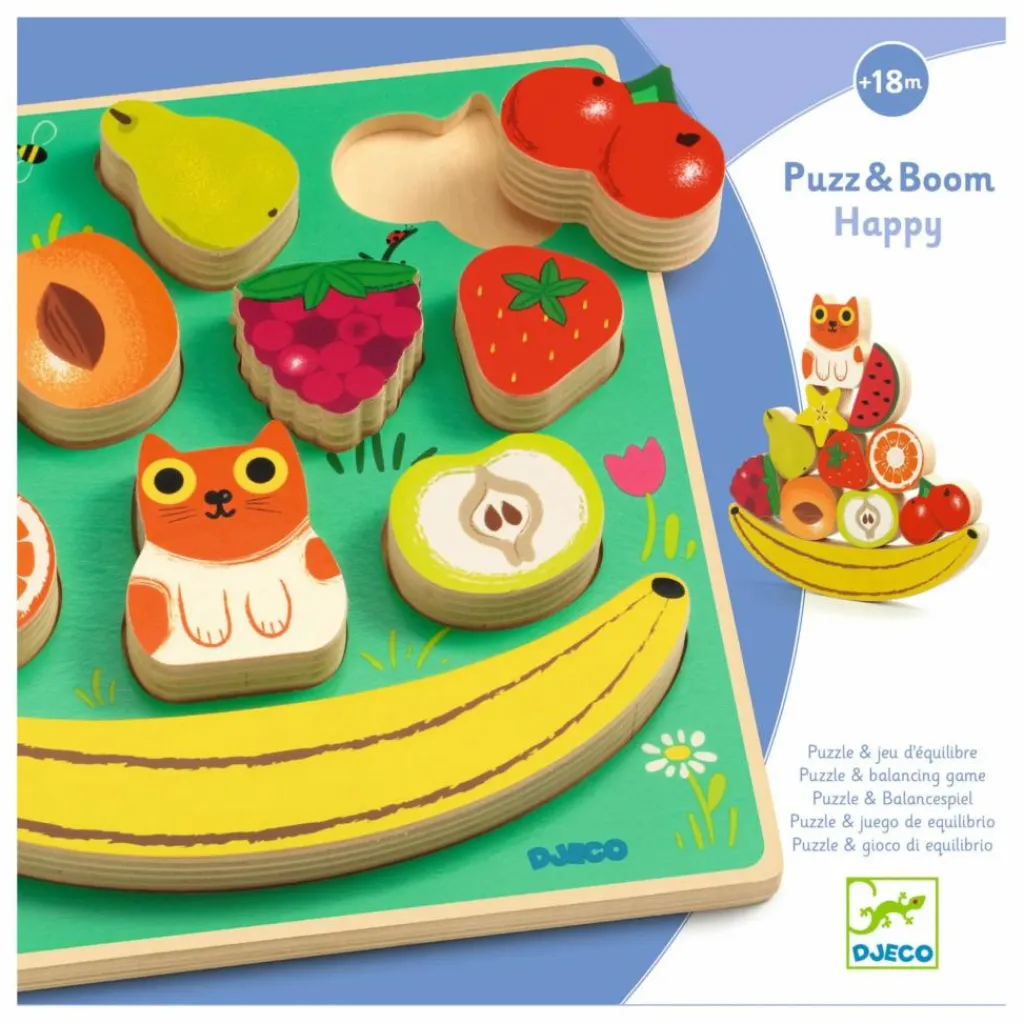 Puzz & Boom est un puzzle en bois facile à assembler et un jeu d’équilibre. Les fruits et le chat en relief tiennent debout et peuvent se poser en équilibre les uns sur les autres pour former une pyramide sur le socle « banane ».
