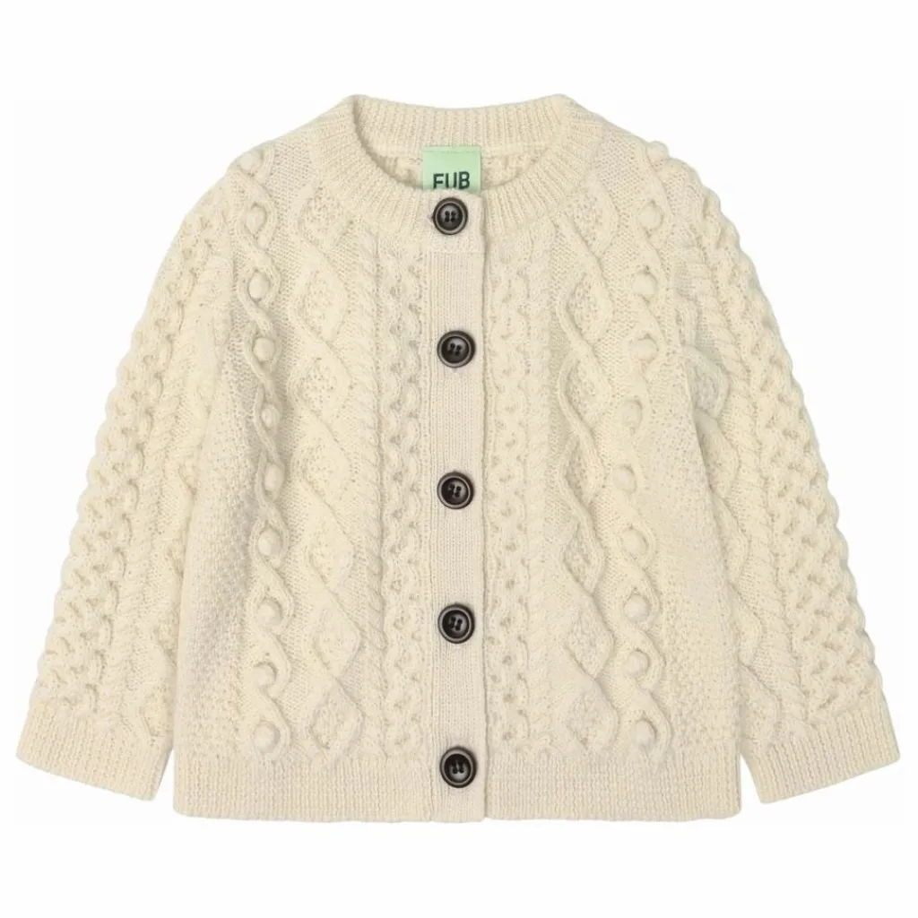 - Ce cardigan pour bébé est tricoté en pure laine mérinos et présente une encolure ronde, des ourlets côtelés et une coupe décontractée. Il se ferme sur le devant à l’aide de boutons en noix de corozo, et le corps et les manches sont tricotés dans un motif Aran graphique. La laine est certifiée BLUESIGN® et RWS, exempte de produits chimiques nocifs, et provient de moutons non mulets.