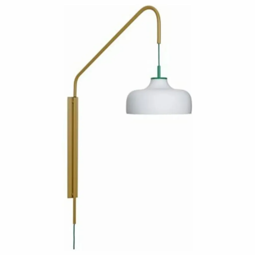 - Grande applique murale en métal de couleur kaki avec un cordon en tissu vert sombre et un abat-jour en verre opale légèrement arrondi.