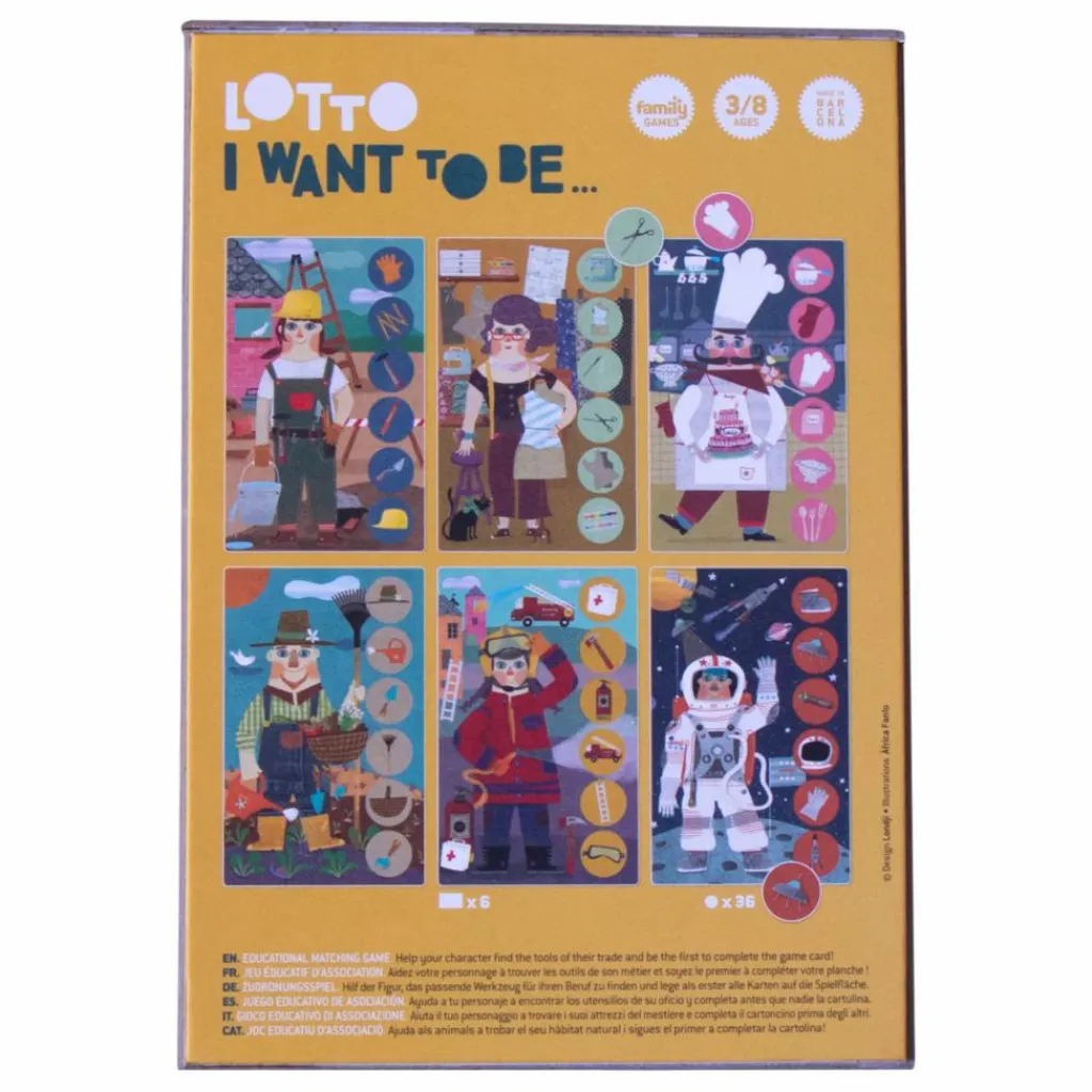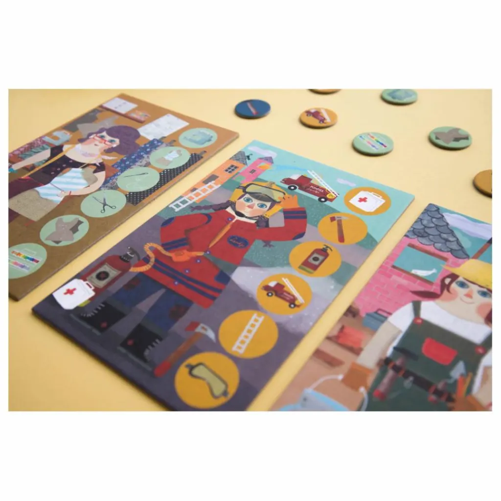 36 jolies cartes rondes qui illustrent différents accessoires de différents métiers. Le gagnant est le joueur qui complète premier son carton.