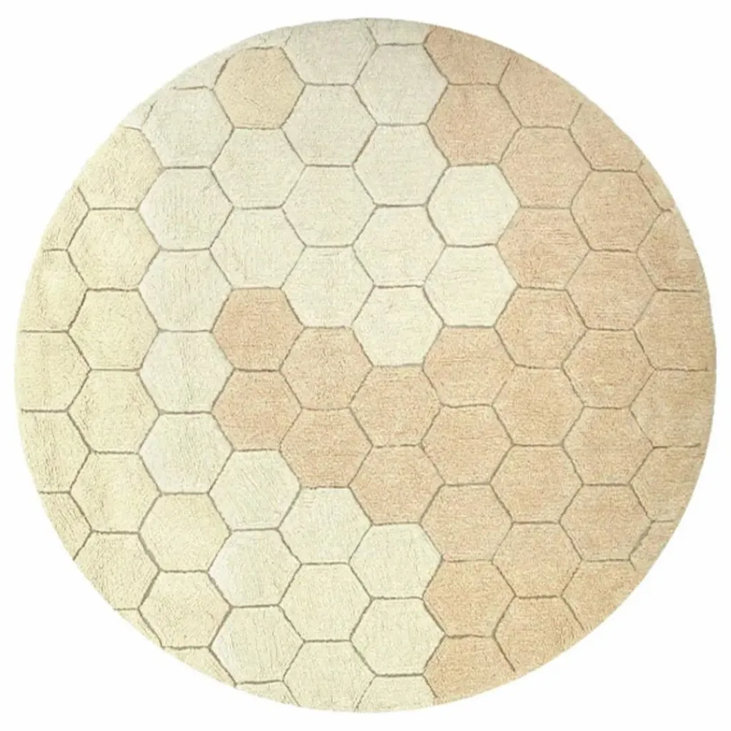 - Inspiré du motif géométrique en nid d’abeille, le tapis Round Honeycomb Golden est composé de doux patchs de couleurs hexagonaux touffetés dans les tons ivoire, vanille et doré. La toile de base est légèrement visible entre les taches de couleur, donnant une surface structurée au tapis.