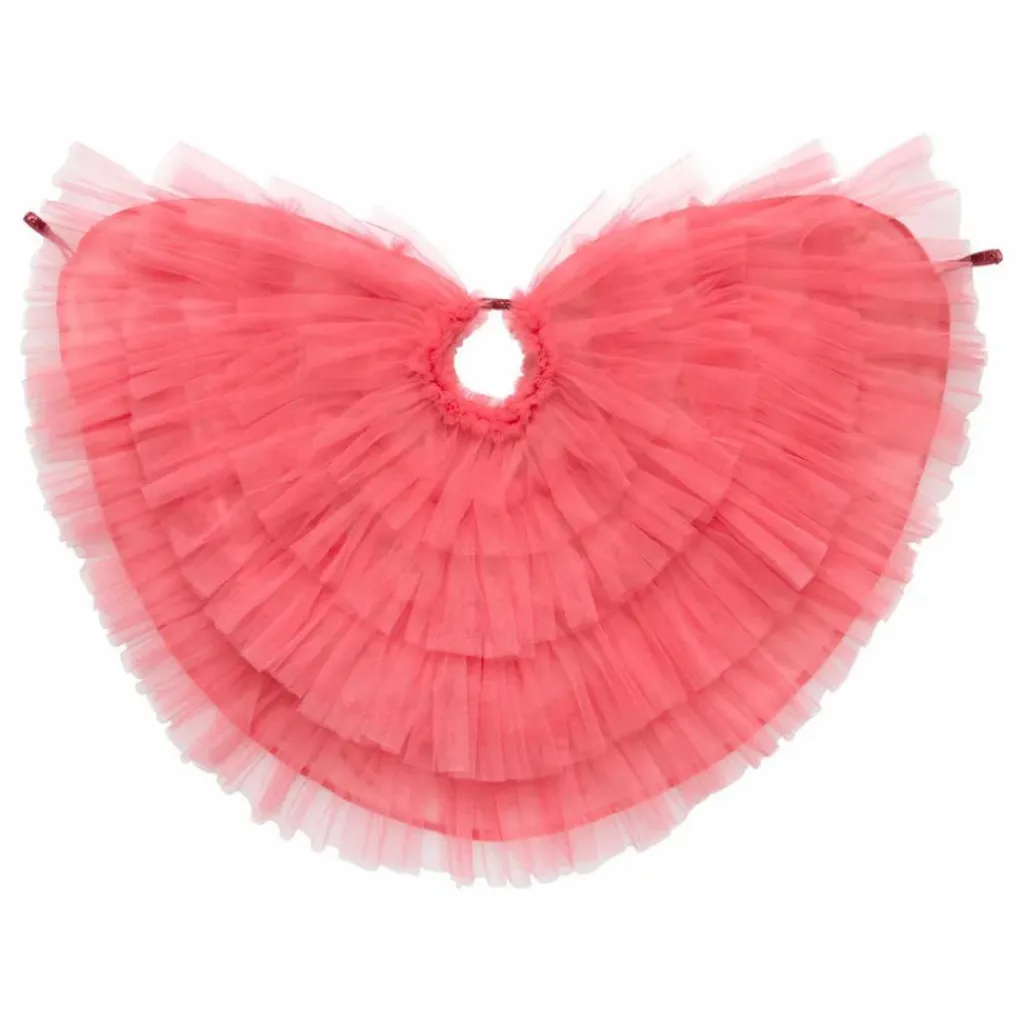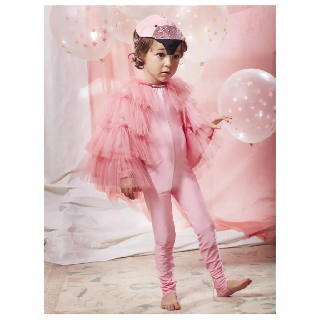 Laissez-les jouer leurs plus belles histoires en se parant de cet incroyable costume de flamant rose. Les ailes sont faites de volants de tulle rose, finies par de jolis bracelets pailletés et la tête du flamant, conçue en velours et parée de jolies broderies, se porte telle une coiffe.