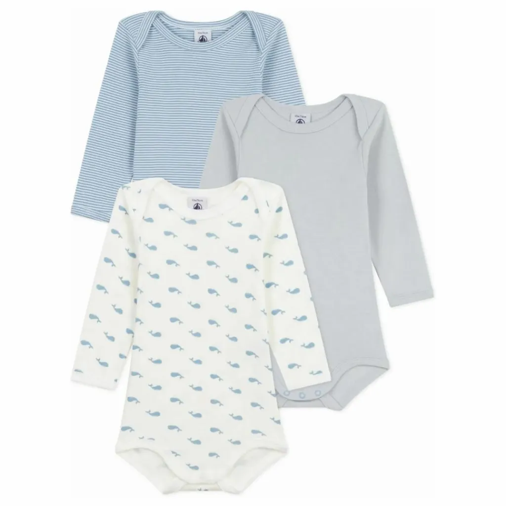 - Pratique grâce à l’encolure américaine et aux boutons-pression à l’entrejambe. Ce lot comprend un body uni, un body imprimé baleine et un body rayures milleraies.