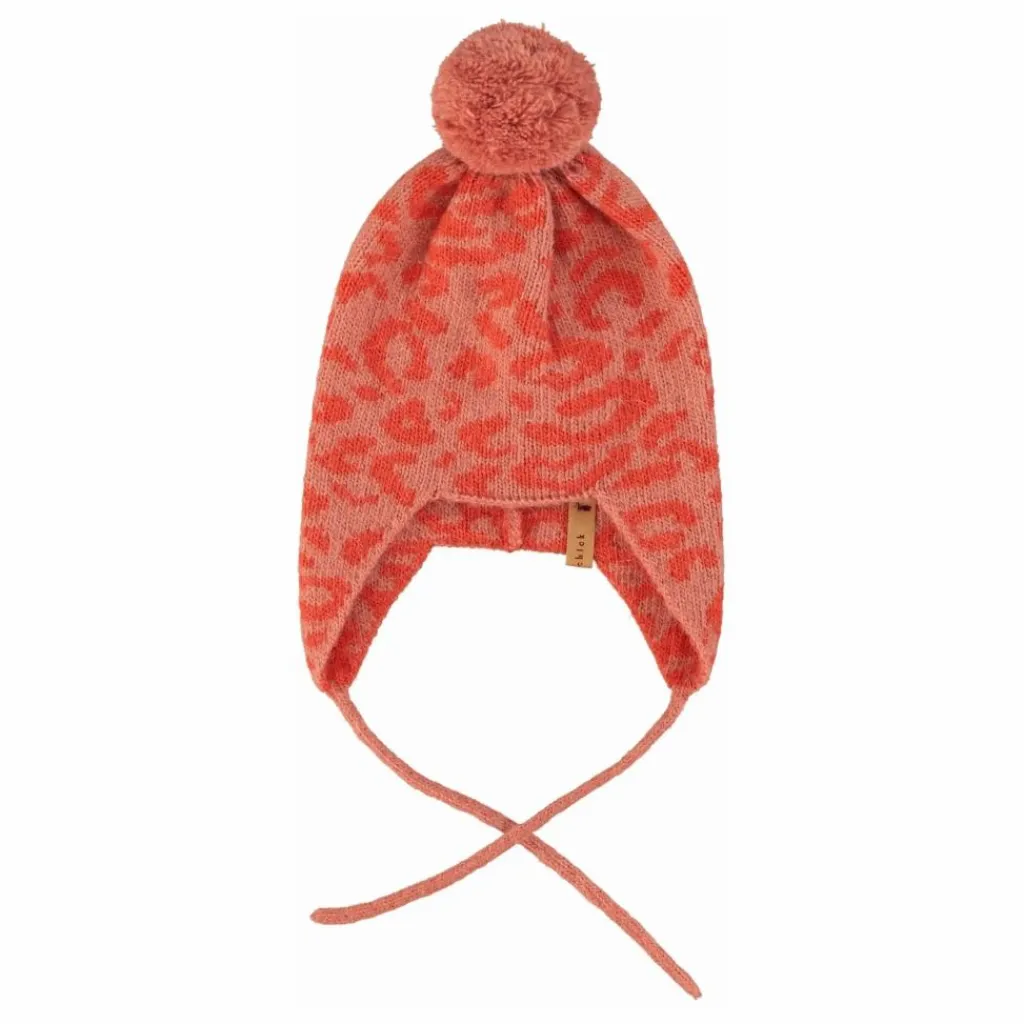 - Bonnet tricoté pour bébé avec pompon, rabats d’oreilles et étiquette logo en cuir.