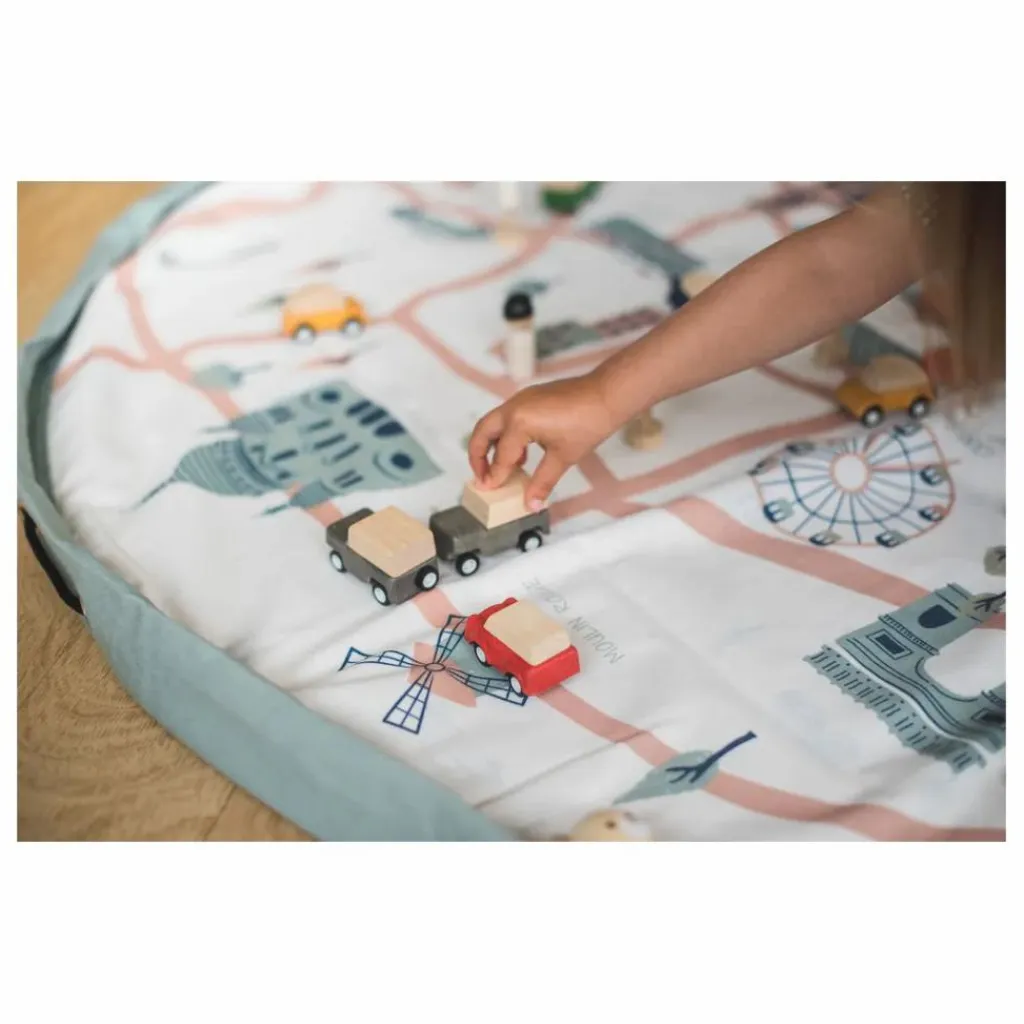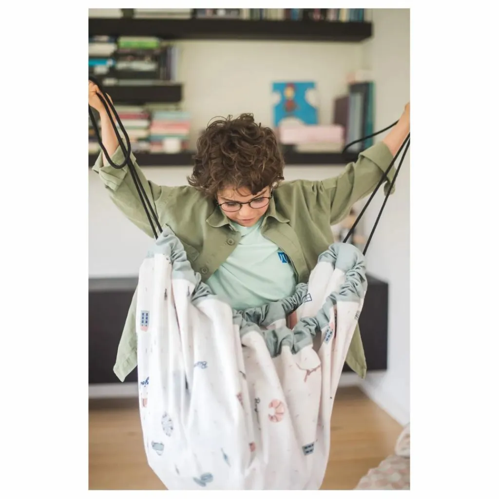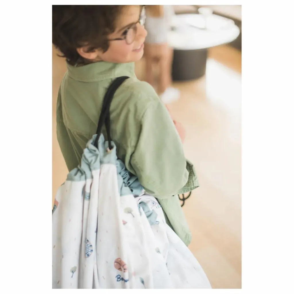 Pratique et léger, ce sac se glisse dans un grand sac à dos, une valise ou se porte simplement seul. Vos enfants seront ravis de pouvoir emporter avec eux leurs jouets. Fabriqué dans un coton très solide, ce sac peut également servir de tapis de jeux.