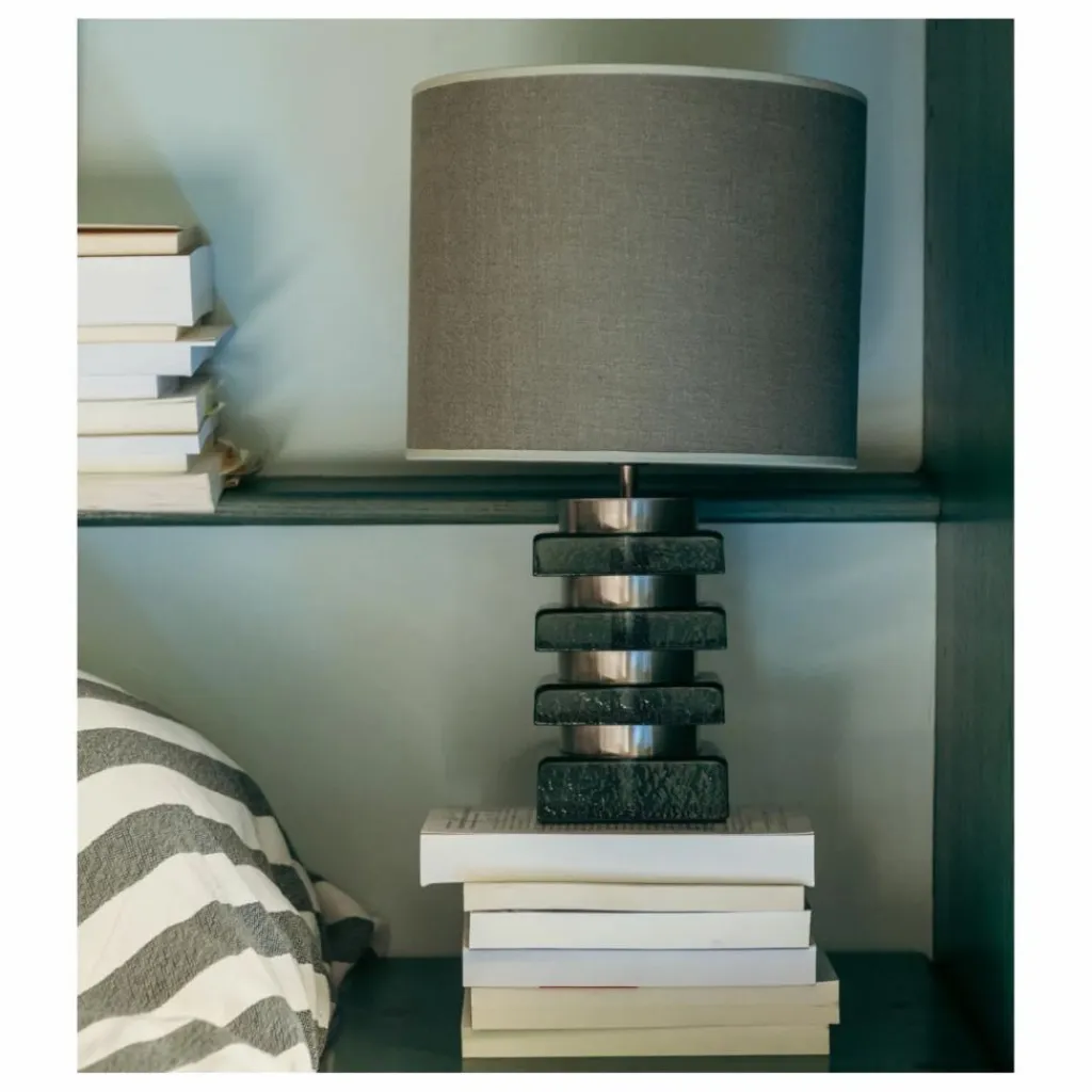 - Matière du pied : pâte de verre peinte et acier brossé.
