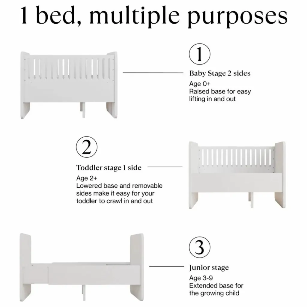 Le lit bébé et junior est un futur classique de conception danoise, offrant un design moderne et fonctionnel pour les deux étapes bébé et junior en un. Ce lit grandit avec votre enfant grâce à sa base réglable et à sa fonction coulissante intégrée, ce qui le rend adapté de la petite enfance à l’adolescence. Il supporte jusqu’à 15 kg dans le réglage du sommier bébé et 80 kg dans le réglage junior.