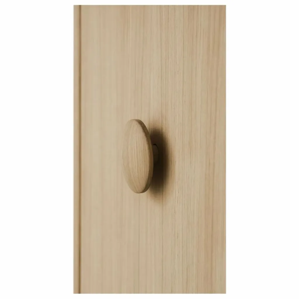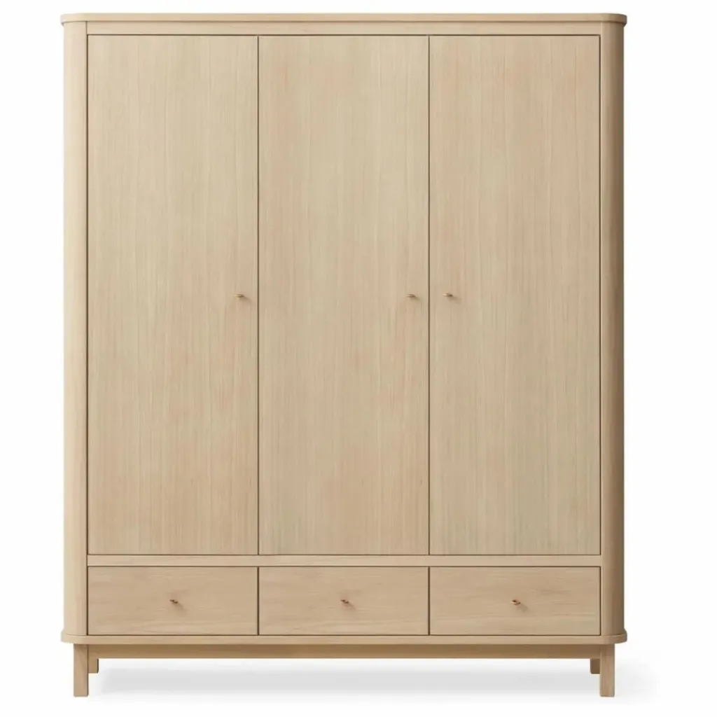 - L’armoire 3 portes Wood est fabriquée en MDF, plaqué chêne. Les pieds et les patères sont en chêne massif huilé blanc. L’intérieur de l’armoire est en MDF peint en blanc.