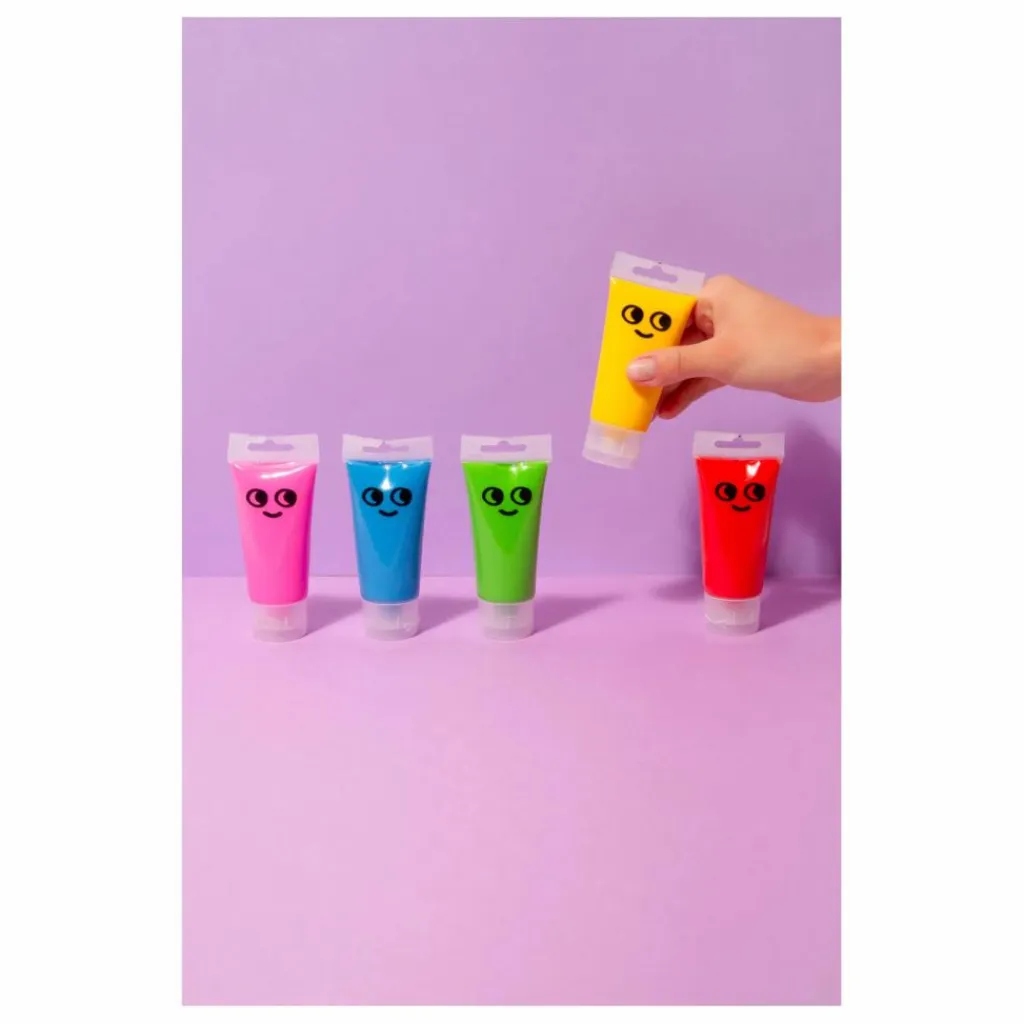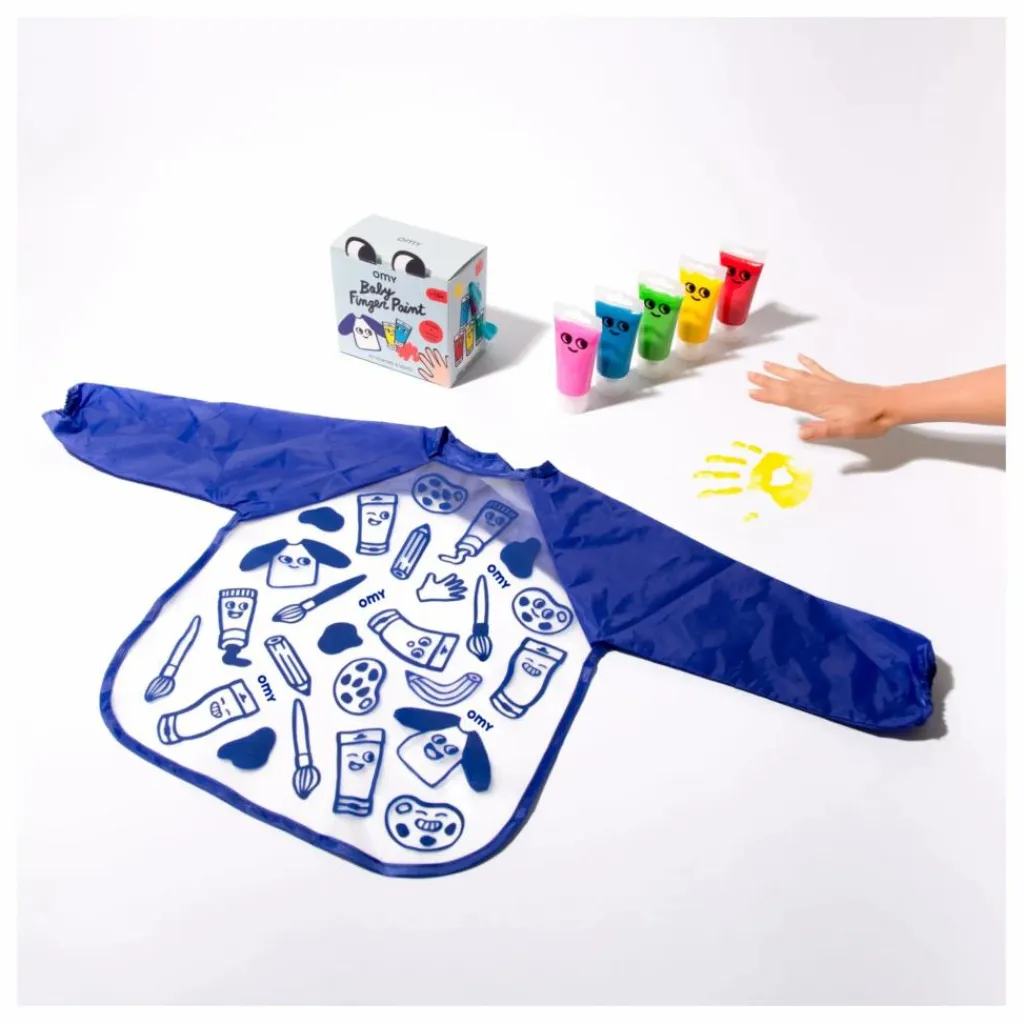Kit de 5 tubes de peinture à l’eau douce et onctueuse, facile à manipuler et à appliquer avec les doigts et une blouse en polyester pour protéger les vêtements.