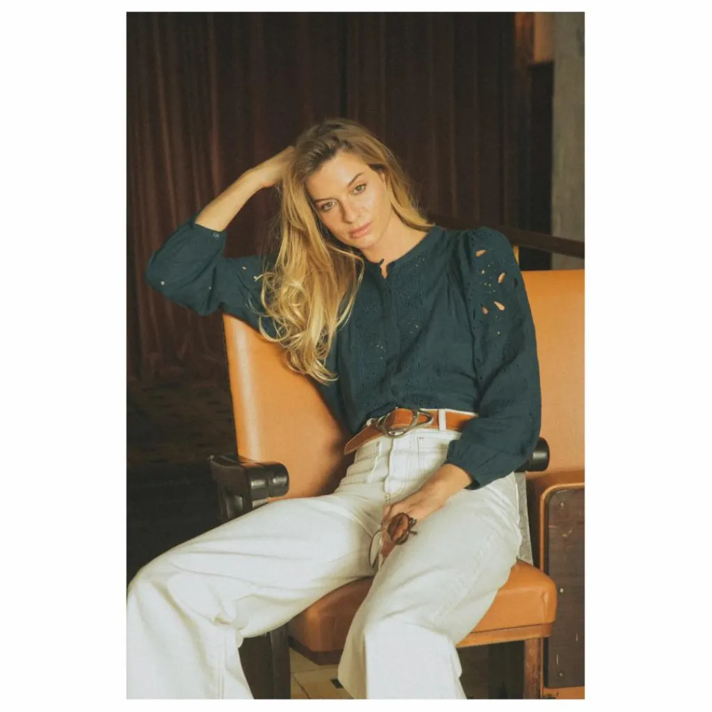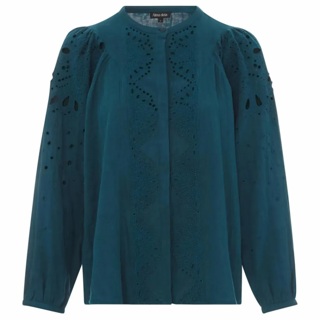 - Broderie anglaise, Manches bouffantes, Poignets boutonnés, Froncé aux épaules, Col mao