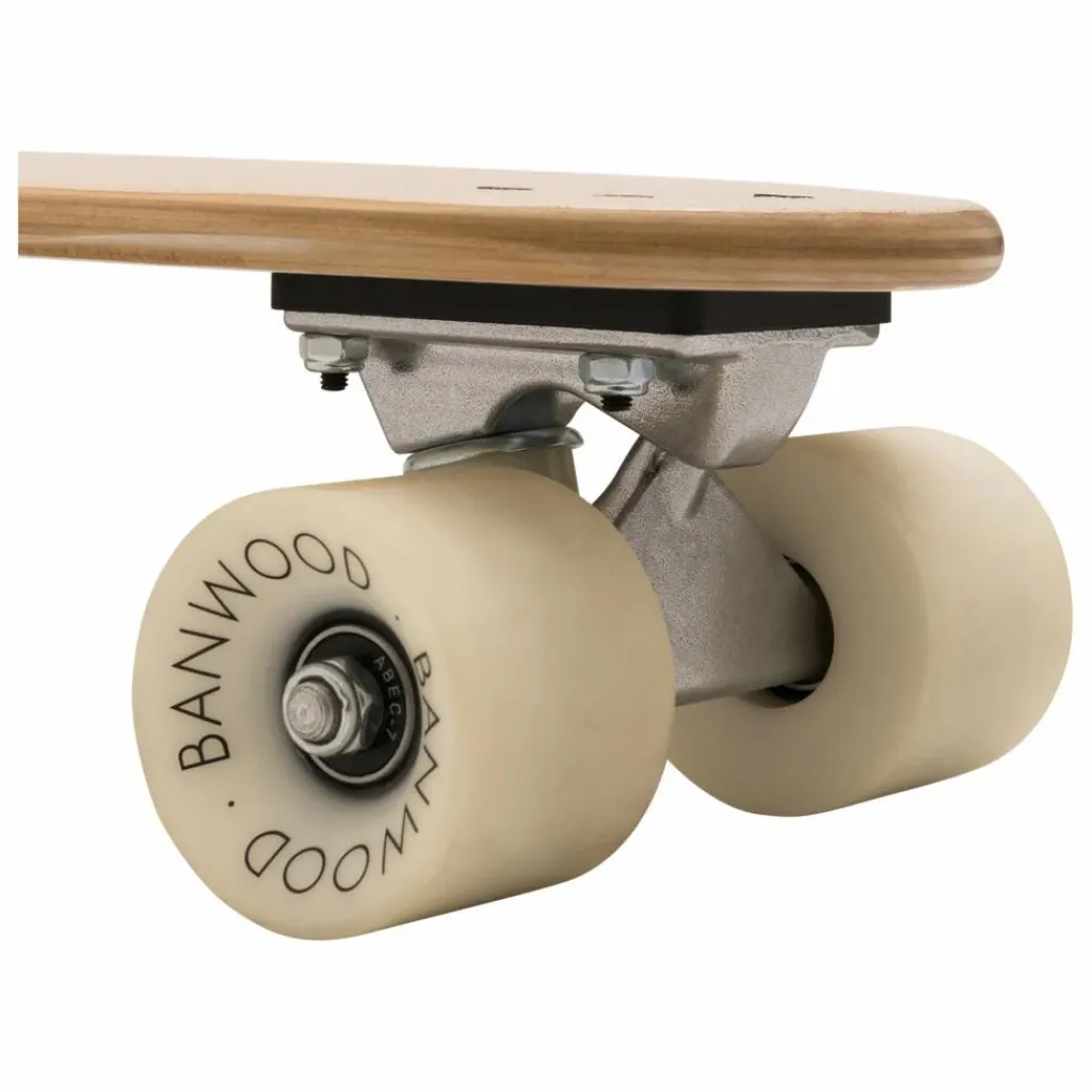 Roues : Roues blanches à haut rebond (SHR80A PU), Roulement ABEC-7 chromé, Coussinet moulé en polyuréthane SHR90A, Trucks et base en aluminium 3,25, Logo Banwood