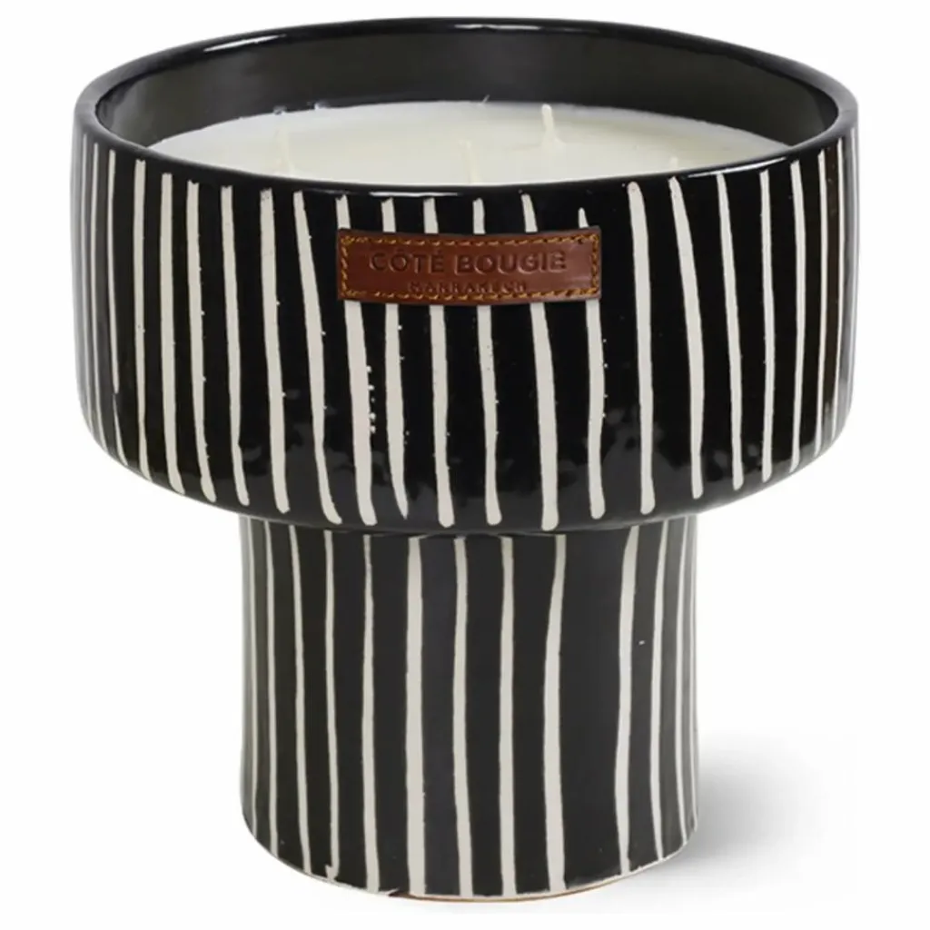 Chaque coupe est tournée, émaillée et peinte à la main par nos artisans céramistes à Marrakech, rendant chaque pièce singulière. Les rayures noires et blanches, inspirées du pelage du zèbre, apportent une touche de caractère et de modernité à votre intérieur. Bougies disponibles en 2 tailles : 80h /100h.