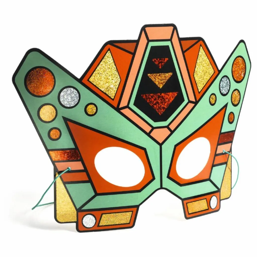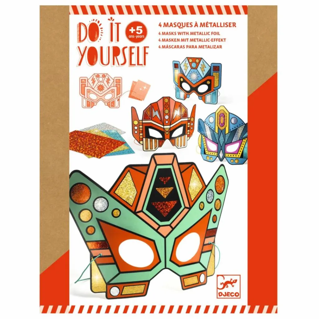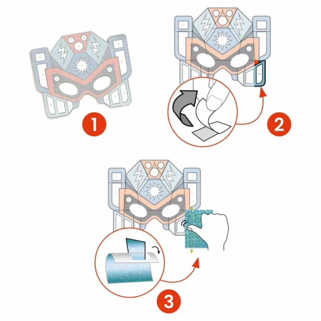 - Un kit créatif pour créer 4 masques de super robots aux reflets métallisés. Grâce aux zones de colle apposées sur les masques, votre enfant dépose la feuille métallisée en suivant la numérotation indiquée sur le pas-à-pas. La matière se dépose comme par magie et les masques se parent d’éclats métalliques du plus bel effet !