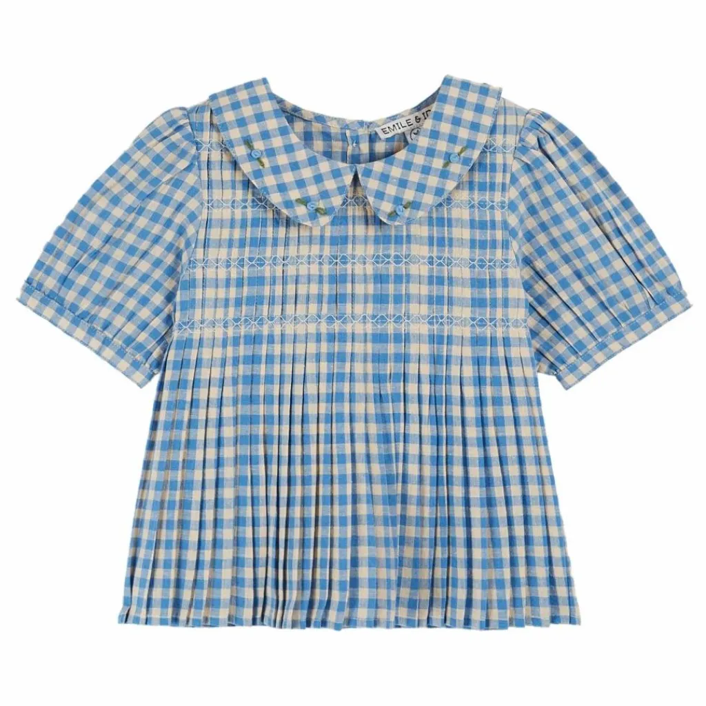Le dos plat contraste avec le devant, très joliment travaillé : les plis plats sur toute la largeur de la blouse sont retenus par quelques lignes de smocks et, grâce à cela, ils restent bien en place. Dans le bas, les plis sont marqués mais libres. Ils structurent, animent et géométrisent le devant de la blouse. Les manches ballon, fermées, comme le dos, avec des boutons en nacre naturelle et le col plat brodé à la main de fleurettes bleues, parfont l’ensemble.