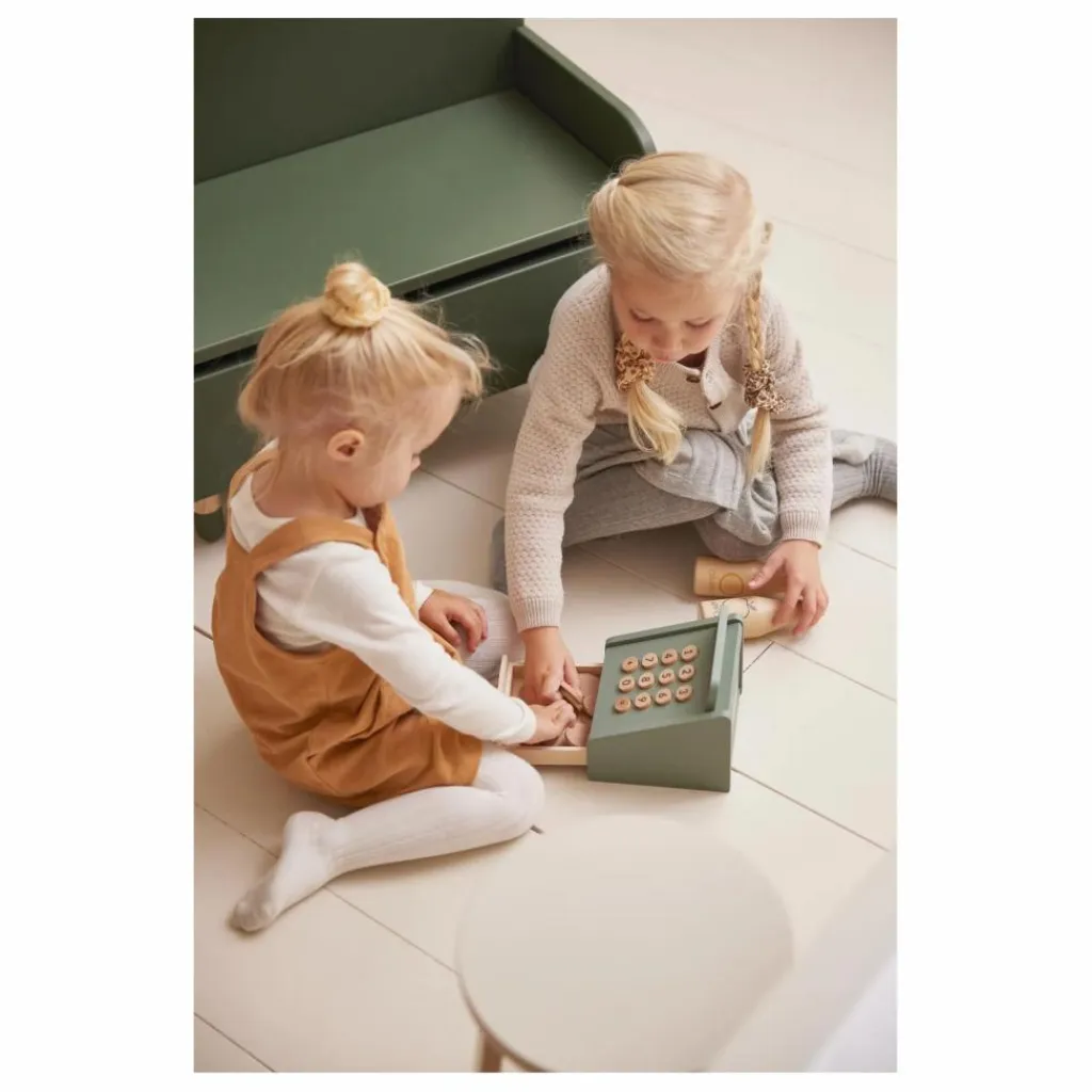 - Cette caisse contient des boutons numérotés sur lesquels appuyer, un tiroir pour les pièces, un petit tableau noir pour écrire le prix, des pièces en bois et une carte de crédit.