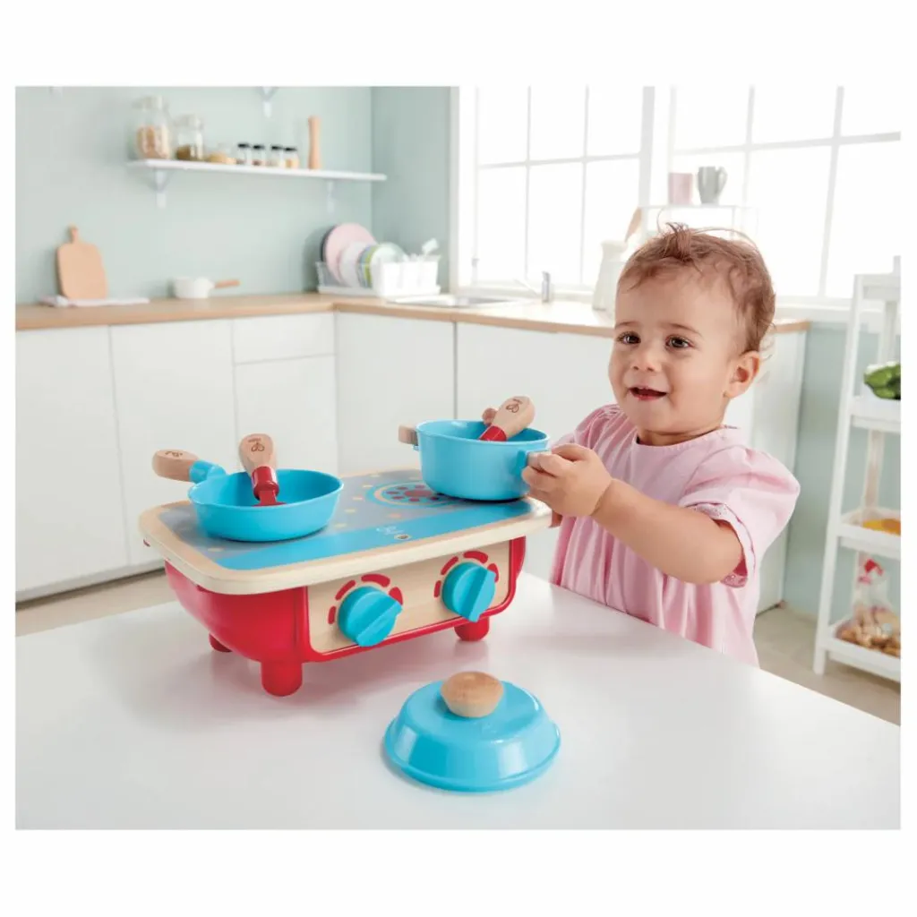 Découvrez la cuisinière Hape et tous ses ustensiles spécialement conçus pour les petites mains. L’ensemble est composé d’un poêle en bois, d’une marmite avec son couvercle, d’une poêle à frire, une cuillère et une spatule.