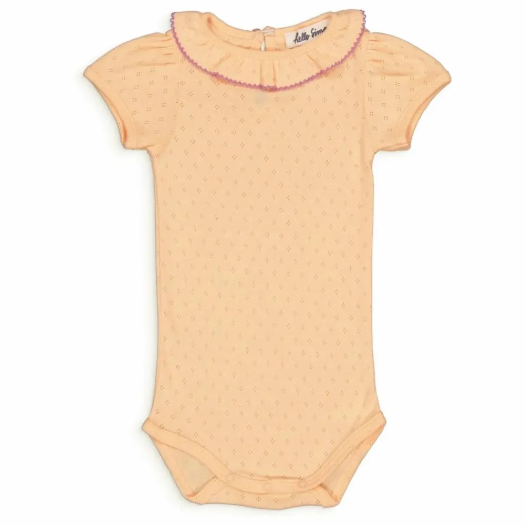 - Corps bébé en pointelle avec col volant en croquet contrasté. Manches courtes avec fronces. Boutons-pression à l’entrejambe et fente au dos avec bouton.