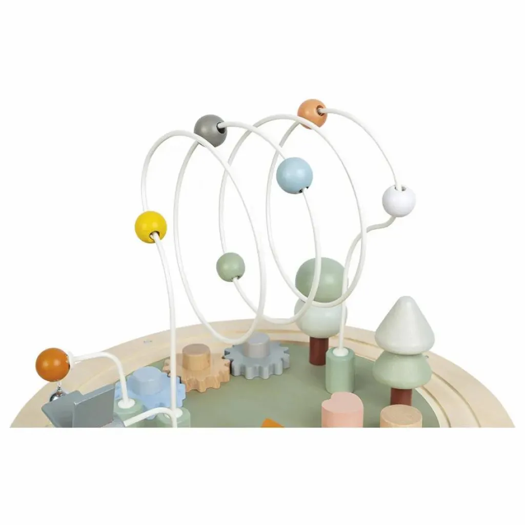 - 1 table d’activités, 1 rail de train circulaire avec 2 véhicules qui font tinter la cloche, 1 petit moulin, 2 arbres à empiler, 3 loopings avec des billes, 3 engrenages à faire tourner, 5 formes à encastrer