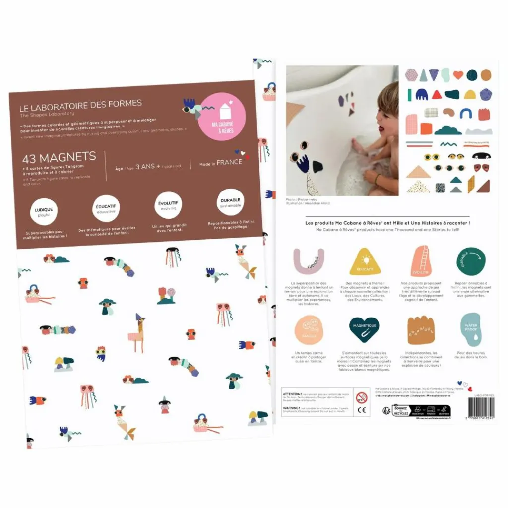 - 43 magnets + 8 cartes de figures Tangram à reproduire et à colorier au dos du packaging.